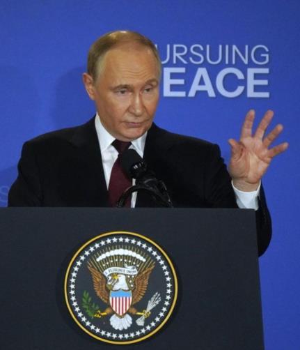 8月15日,俄羅斯總統(tǒng)普京與美國(guó)總統(tǒng)特朗普(未在畫面中)在美國(guó)阿拉斯加州安克雷奇市埃爾門多夫-理查森聯(lián)合軍事基地舉行會(huì)晤后共同出席聯(lián)合記者會(huì)。新華社記者吳曉凌攝