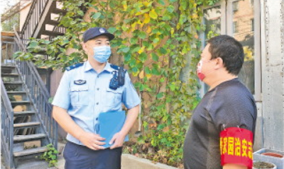 圖為王維和志愿者溝通轄區(qū)治安情況。