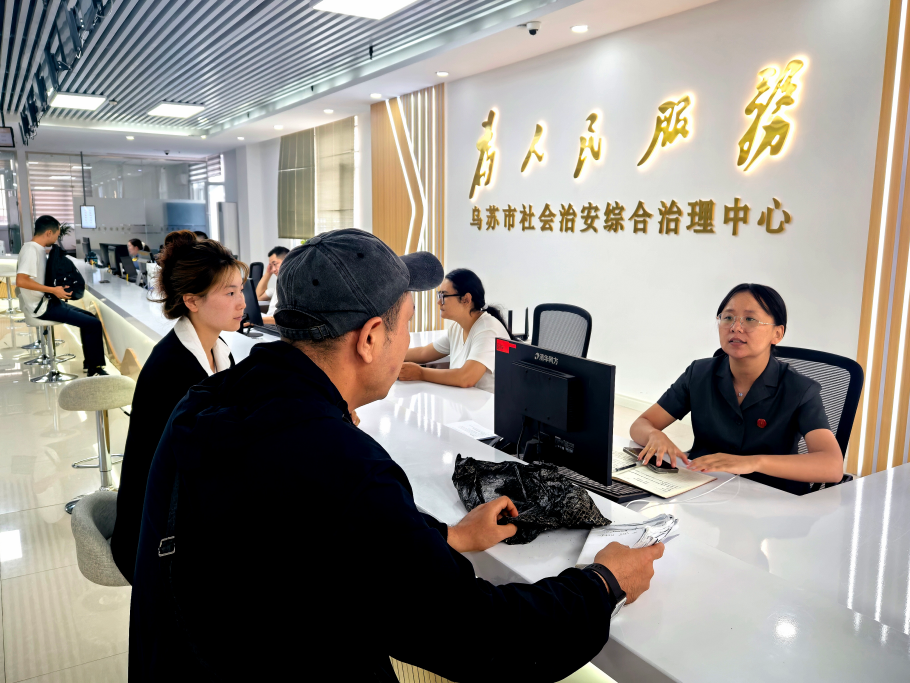 圖為9月11日,在烏蘇市社會(huì)治安綜合治理中心,工作人員正在接待來訪群眾。