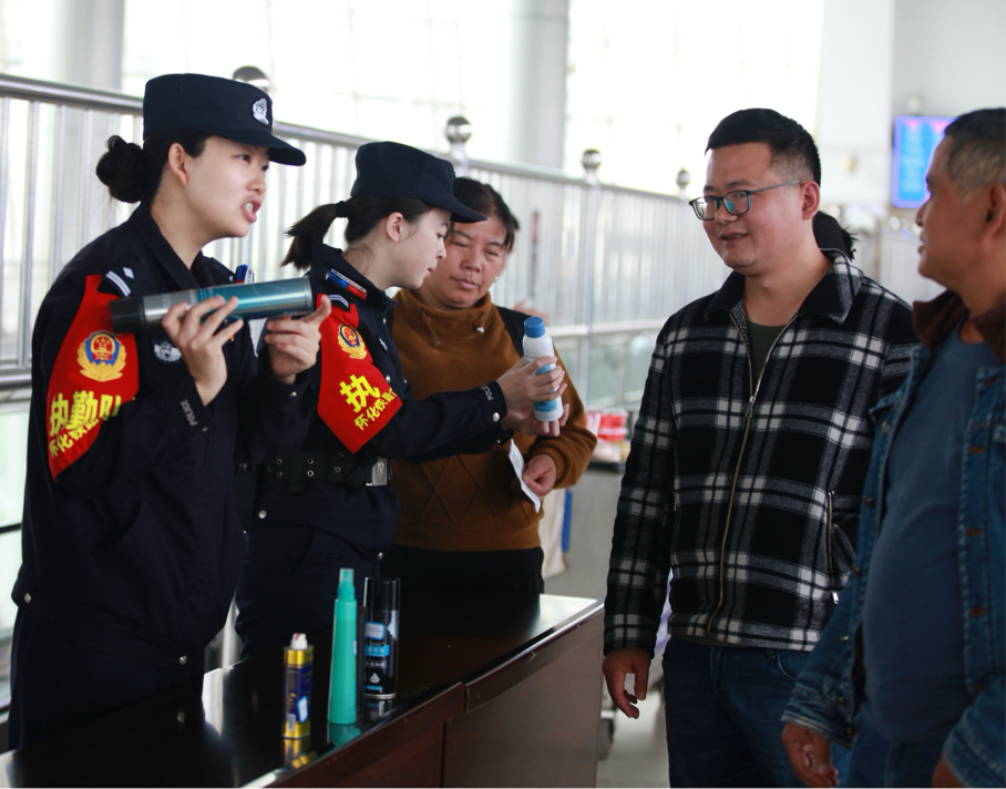 活動現(xiàn)場,民警向旅客宣傳了鐵路乘車的安全規(guī)定,并拿著甲烷氣體、汽油、酒精等實物,告訴他們哪些屬于易燃易爆危險物品,為什么禁止攜帶進站,以及將會造成怎么樣的嚴重后果。