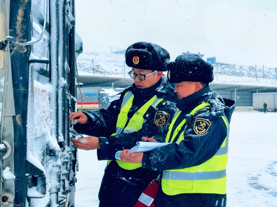圖為卡拉蘇海關(guān)關(guān)員在貨場(chǎng)口岸對(duì)車輛施封。