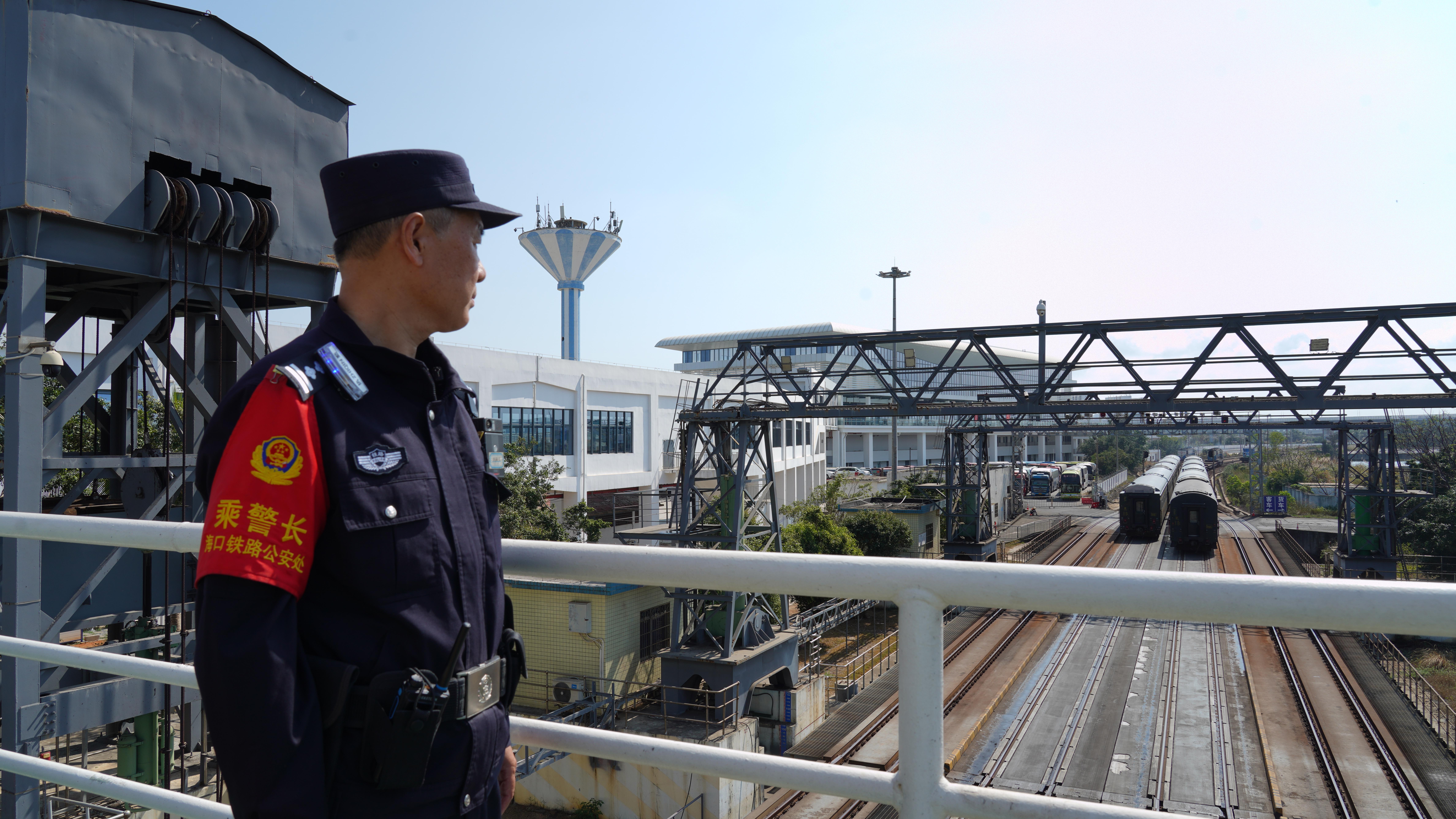 海口鐵路公安處南港站派出所民警張發(fā)偉在站崗執(zhí)勤。汪楚雯攝影