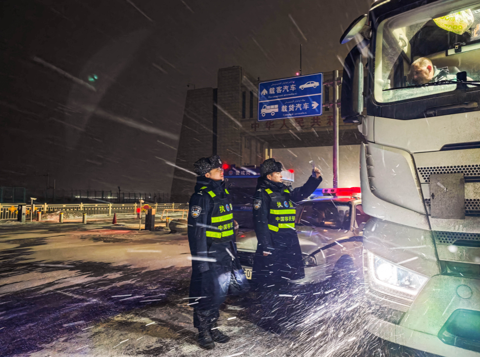 又一列滿載汽車配件的中歐班列緩緩?fù)??,幾名移民管理警察臂挽臂,艱難地頂風(fēng)迎上去,開展車體安全檢查。