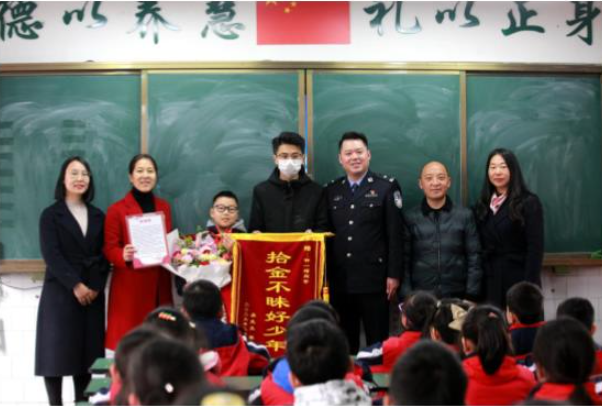 “拾金不昧好少年!”日前,四川資陽市雁江七小,失主吳先生和民警送來錦旗和《表揚信》,希望學校公開表揚該校四年級學生鐘一瑁,讓更多孩子向他學習,一樣拾金不昧。