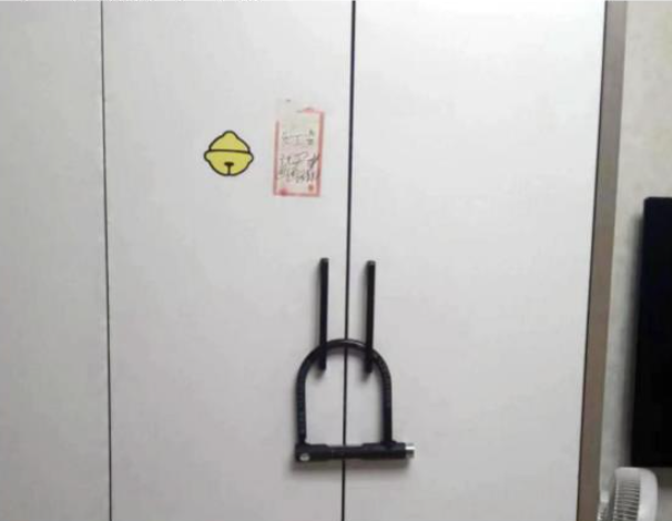 鐘一瑁同學為了保管好,還把自行車鎖掛在了裝有黃金的衣柜拉手上。