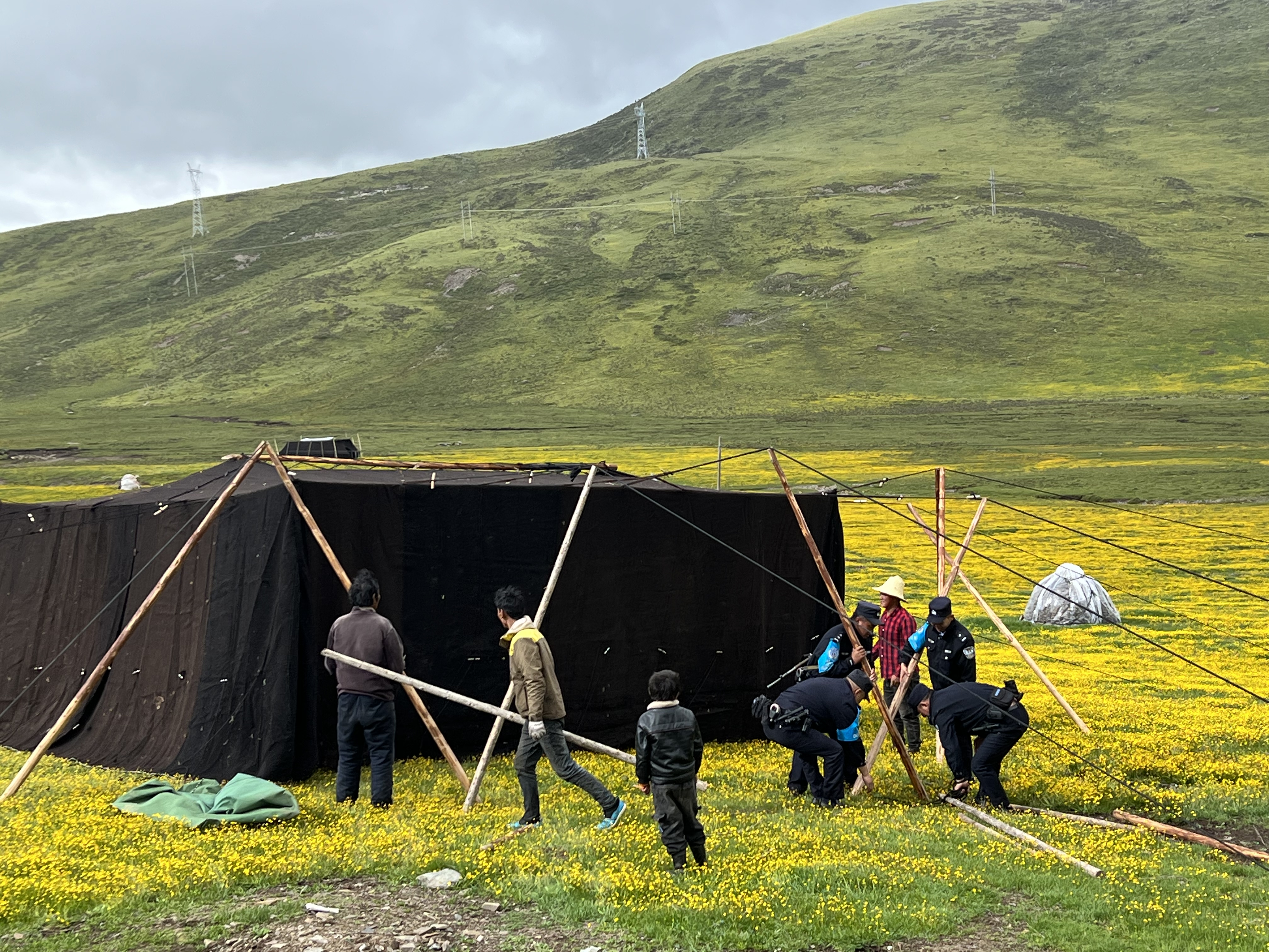 返程途中,高照洪所長和戰(zhàn)友們遇見安孜鄉(xiāng)門馬一、二村村民正在冒雨搭建夏季牧場的黑帳篷,隨即下車幫助牧民一同搭建,并向牧民群眾宣講了道路交通安全、森林草原防滅火、防汛期防護、嚴防“偷牛盜馬”及保護個人財產(chǎn)等方面的知識。