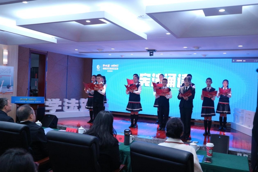 主題活動在學生代表們憲法誦讀中拉開序幕,以此弘揚憲法精神,增強學生憲法意識,為推進全面依法治區(qū)營造了濃厚的法治氛圍。