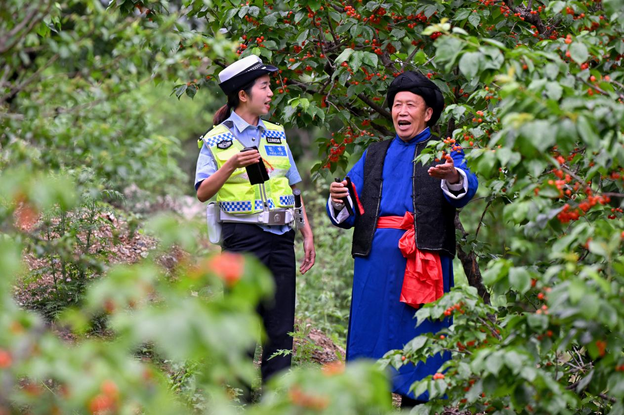 “所有開車駕駛員,自我告誡重三件。發(fā)動車輛開車前,重要部位查一遍。發(fā)動車輛開車前,排除隱患保安全。所有開車駕駛員,發(fā)動車輛開車前,系安全帶要規(guī)范。安全行駛最重要,平平安安回家園?!?月25日下午,正值2024年瀘定紅櫻桃采摘體驗季推薦會在四川省甘孜州瀘定縣冷磧鎮(zhèn)杵坭櫻桃谷即將開幕之際,在果實累累的杵坭村櫻桃樹下,有“微笑交警”之譽的劉格蘆會同省級非物質(zhì)文化遺產(chǎn)瀘定山歌傳承人吳全清老人,冒著細(xì)雨一道錄制《開車自我告誡重三件》快板說唱視頻,用于在線上“平安甘孜”傳播護航五一小長假。