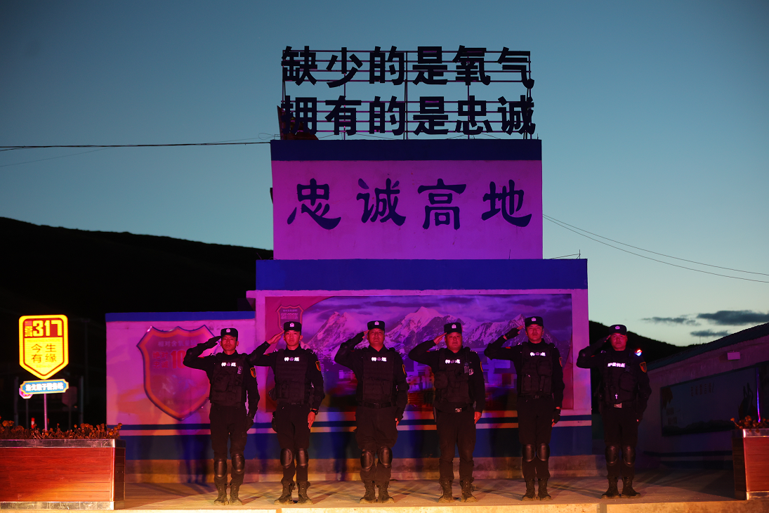 當(dāng)爐霍衛(wèi)士遇見(jiàn)王城衛(wèi)士,忠誠(chéng)如山是他們共同的信仰。2023年10月15日傍晚,率隊(duì)到充古鄉(xiāng)執(zhí)行任務(wù)的楊進(jìn)前,任務(wù)完成空隙之際組織5名隊(duì)員前往3980米的洛戈梁子警務(wù)站,在夜空下聆聽(tīng)“忠誠(chéng)高地”上的故事。凡人微光,最是平凡。洛戈梁子警務(wù)站身處川藏線上的“紅色”山梁,與爐霍縣山水相連。楊進(jìn)前和“雷鋒”所長(zhǎng)劉鵬所長(zhǎng)系四川警院同學(xué),在工作中常有往來(lái),緊密協(xié)助。這些年,隨著“缺少的是氧氣、擁有的是忠誠(chéng)”在全州唱響,楊進(jìn)前時(shí)常被感動(dòng),更心生敬意。因此趁下鄉(xiāng)之際,專(zhuān)門(mén)帶領(lǐng)年輕戰(zhàn)友們赴洛戈梁子接受忠誠(chéng)的洗禮,汲取奮進(jìn)的力量。忠誠(chéng)印寸心,浩然充兩間。楊進(jìn)前相信,當(dāng)他們?cè)谝箍罩杏L(fēng)致敬的那一刻,當(dāng)紅藍(lán)閃爍中在忠誠(chéng)墻上映出忠誠(chéng)的身影時(shí),這是霍爾衛(wèi)士追光路上最美的偶遇,最強(qiáng)的感召。