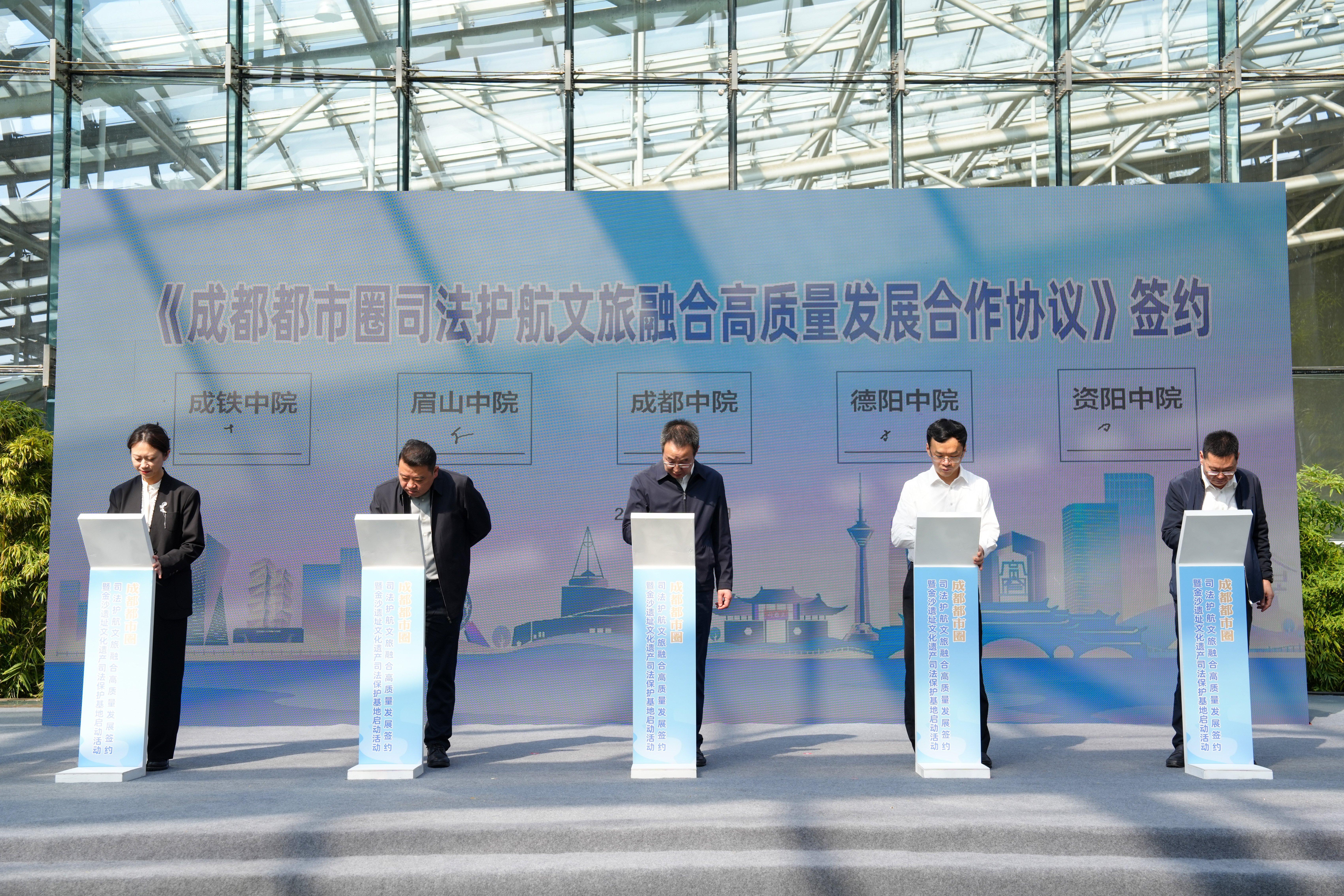 10月28日,四川成都都市圈司法護(hù)航文旅融合高質(zhì)量發(fā)展簽約儀式在成都金沙遺址博物館舉行。成都、德陽(yáng)、眉山、資陽(yáng)、成都鐵路運(yùn)輸5家中院共同簽署《關(guān)于成都都市圈司法護(hù)航文旅融合高質(zhì)量發(fā)展合作協(xié)議》。