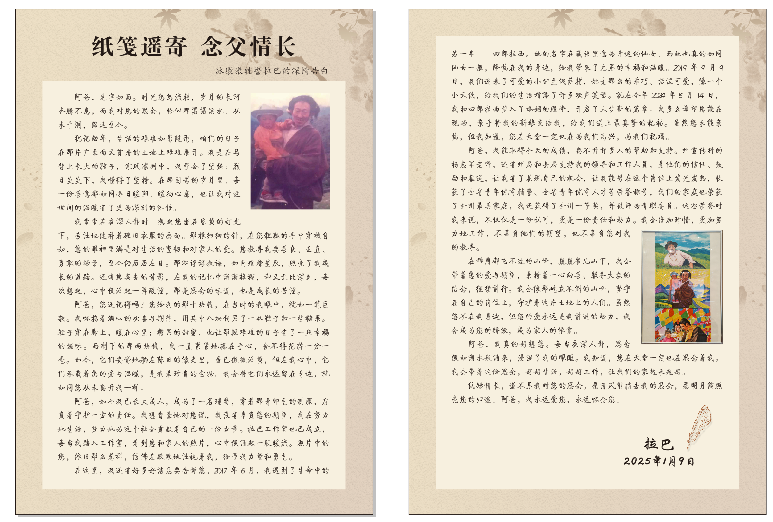 “阿爸,見(jiàn)字如面。時(shí)光悠悠流轉(zhuǎn),歲月的長(zhǎng)河奔騰不息,而我對(duì)您的思念,恰似那潺潺溪水,從未干涸,綿延至今。我常常在夜深人靜時(shí),想起您坐在昏黃的燈光下,專(zhuān)注地縫補(bǔ)著破舊衣服的畫(huà)面。那根細(xì)細(xì)的針,在您粗糙的手中穿梭自如,您的眼神里滿是對(duì)生活的堅(jiān)韌和對(duì)家人的愛(ài)。您教導(dǎo)我要善良、正直、勇敢的場(chǎng)景,至今仍歷歷在目。那些諄諄教誨,如同璀璨星辰,照亮了我成長(zhǎng)的道路。阿爸,您還記得嗎?您給我的那十塊錢(qián),在當(dāng)時(shí)的我眼中,猶如一筆巨款。我懷揣著滿心的歡喜與期待,用其中八塊錢(qián)買(mǎi)了一雙鞋子和一些糖果。鞋子穿在腳上,暖在心里;糖果的甜蜜,也讓那段艱難的日子有了一絲幸福的滋味。而剩下的那兩塊錢(qián),我一直緊緊地攥在手心,舍不得花掉一分一毫。如今,它們安靜地躺在陳舊的像夾里,雖已微微泛黃,但在我心中,它們承載著您的愛(ài)與溫暖,是我最珍貴的寶物。我會(huì)將它們永遠(yuǎn)留在身邊,就如同您從未離開(kāi)我一樣。在這里,我還有好多好消息要告訴您。2017年6月,我遇到了生命中的另一半——四郎拉西。她的名字在藏語(yǔ)里意為幸運(yùn)的仙女,而她也真的如同仙女一般,降臨在我的身邊,給我?guī)?lái)了無(wú)盡的幸福和溫暖。2019年9月9日,我們迎來(lái)了可愛(ài)的小公主俄薩措,她是那么的乖巧、活潑可愛(ài),像一個(gè)小天使,給我們的生活增添了許多歡聲笑語(yǔ)。在雄鷹都飛不過(guò)的山峰,巍巍雀兒山下,我會(huì)帶著您的愛(ài)與期望,秉持著一心向善、服務(wù)大眾的信念,繼續(xù)前行。我會(huì)像那屹立不倒的山峰,堅(jiān)守在自己的崗位上,守護(hù)著這片土地上的人們。雖然您不在我身邊,但您的愛(ài)永遠(yuǎn)是我前進(jìn)的動(dòng)力,我會(huì)成為您的驕傲,成為家人的依靠?!边@是一封來(lái)自德格縣的輔警拉巴寫(xiě)給父親的信,信件以樸素的詞匯表達(dá)了對(duì)已故父親的思念,以及自己將謹(jǐn)遵父親教誨,努力在崗位上發(fā)光發(fā)熱的決心。