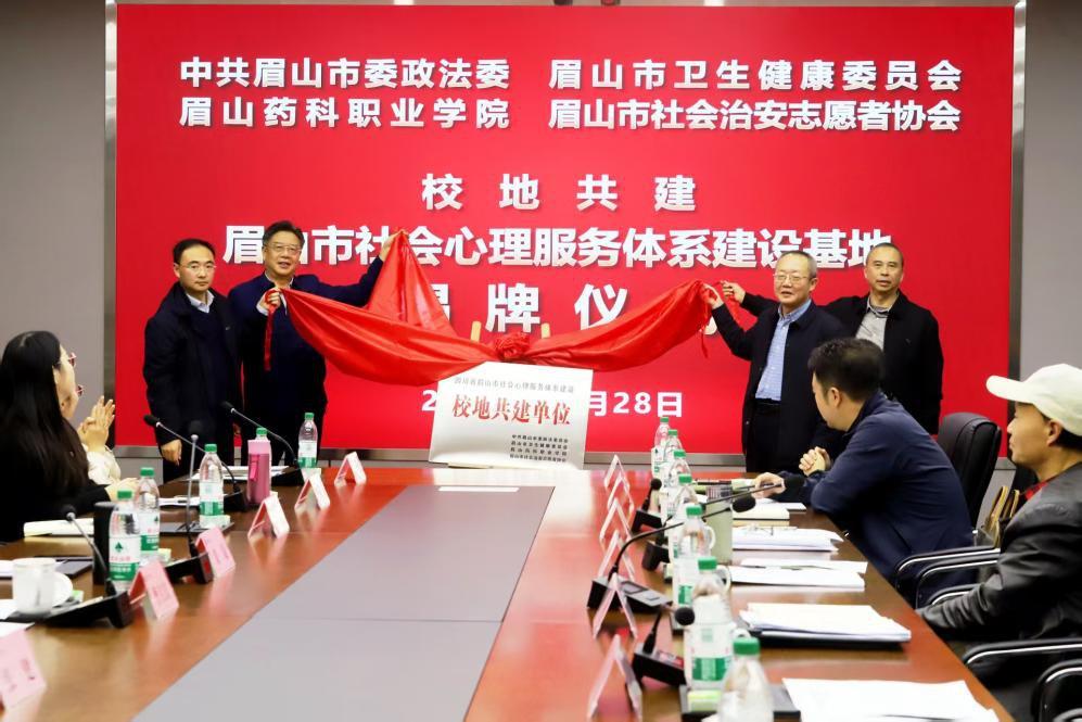 簽約儀式上,眉山藥科職業(yè)學(xué)院心理健康教育咨詢中心的工作人員首先介紹了基地共建的背景、目的與意義。隨后,中共眉山市委政法委、眉山市衛(wèi)生健康委員會(huì)、眉山藥科職業(yè)學(xué)院、眉山市社會(huì)治安志愿者協(xié)會(huì)共同簽訂四方共建協(xié)議,并為基地揭牌,同時(shí)為心理健康知識(shí)宣傳志愿服務(wù)隊(duì)授牌授旗。
