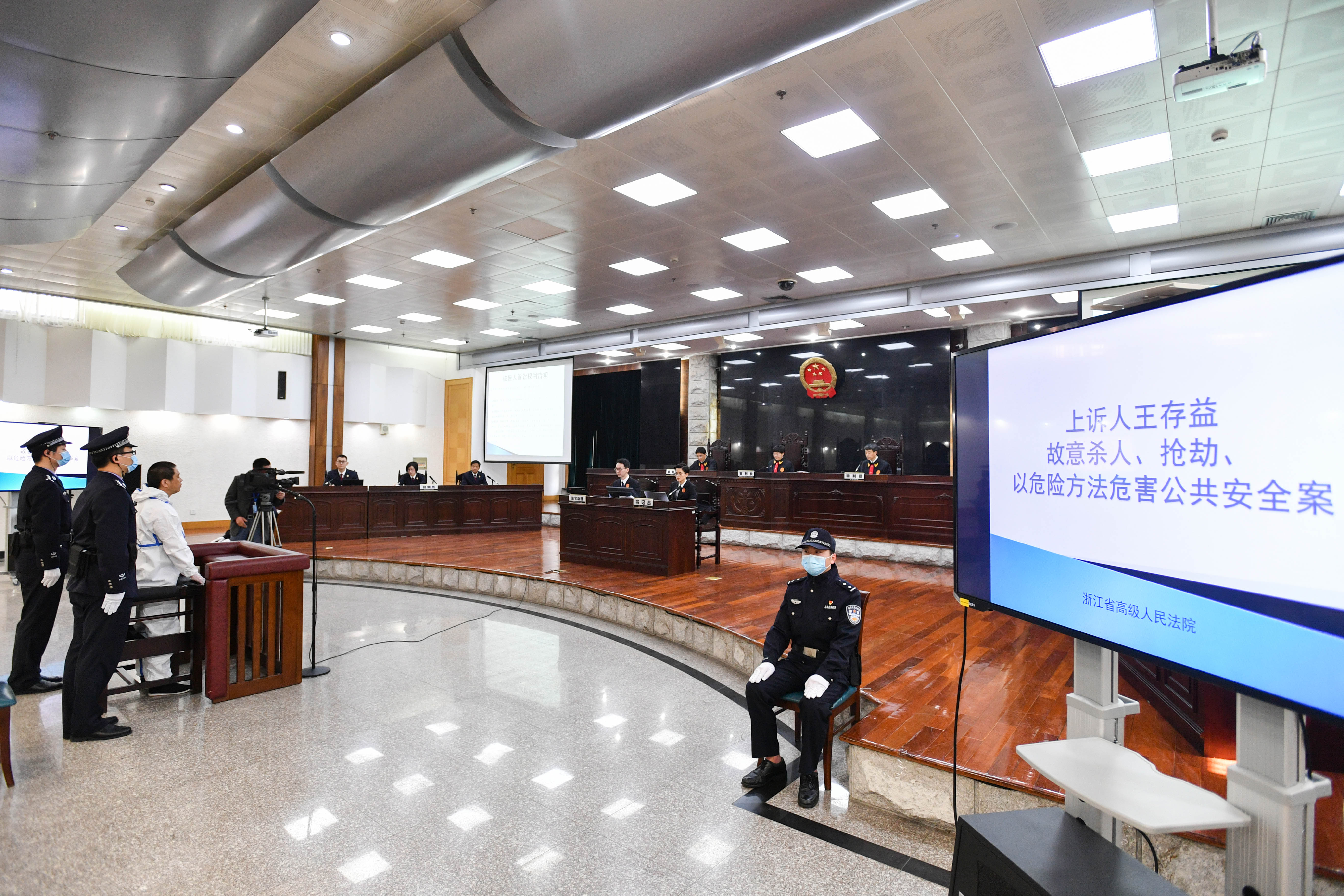 今年4月17日上午,浙江省高級人民法院二審公開開庭審理了王存益故意殺人、搶劫、以危險(xiǎn)方法危害公共安全案。浙江省人民檢察院檢察長、二級大檢察官賈宇與檢察員黃茜霞、李明出庭履行職務(wù),浙江高院副院長陳志君擔(dān)任審判長,法官梁健、侯天柱擔(dān)任審判員,上訴人王存益及其二審辯護(hù)人出庭參加訴訟。
