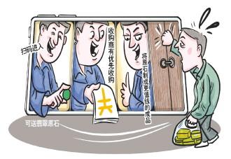 交易完成后,圈套進(jìn)一步縮緊:主播會(huì)安排由“托兒”假扮的收購(gòu)商向購(gòu)買者加價(jià)收購(gòu),獲取信任,待其嘗到甜頭追加高額投入后,主播便會(huì)以“翡翠原石系盜竊所得”“翡翠原石被緬甸軍方查扣”等借口,引誘購(gòu)買者委托其將所購(gòu)翡翠原石制成成品。經(jīng)調(diào)查,這些成品系主播團(tuán)隊(duì)以10元至百元不等的價(jià)格自攤販處收購(gòu),盡管它們含有翡翠元素,卻是價(jià)值極低的邊角料、廢料。
