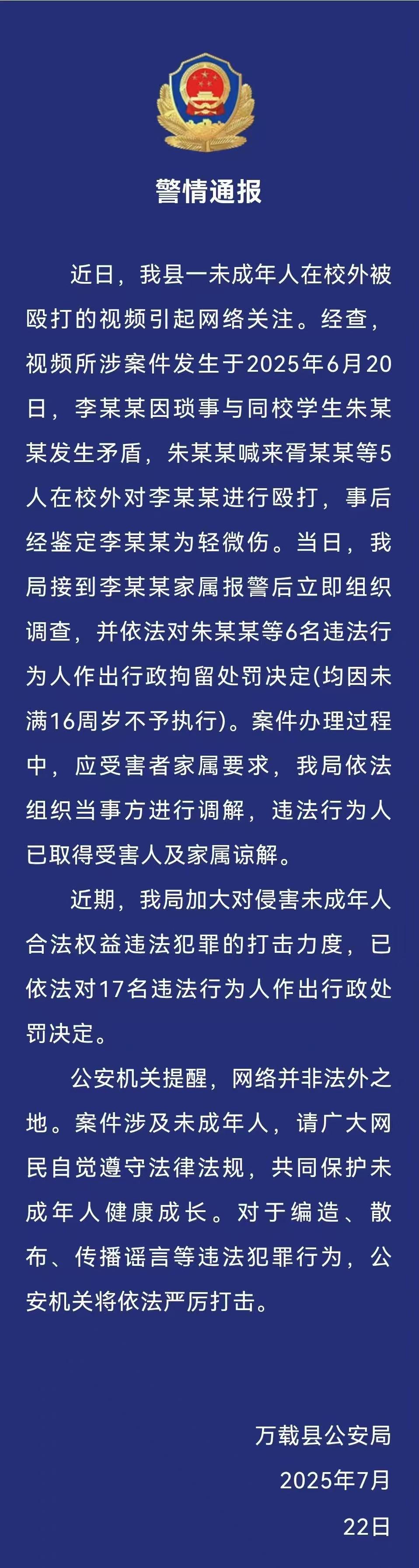 近日,江西省萬(wàn)載縣一未成年人在校外被毆打的視頻引起網(wǎng)絡(luò)關(guān)注。7月22日晚,萬(wàn)載縣公安局發(fā)布警情通報(bào),被毆打未成年人李某某經(jīng)鑒定為輕微傷,公安機(jī)關(guān)依法對(duì)朱某某等6名違法行為人作出行政拘留處罰決定(均因未滿16周歲不予執(zhí)行)。