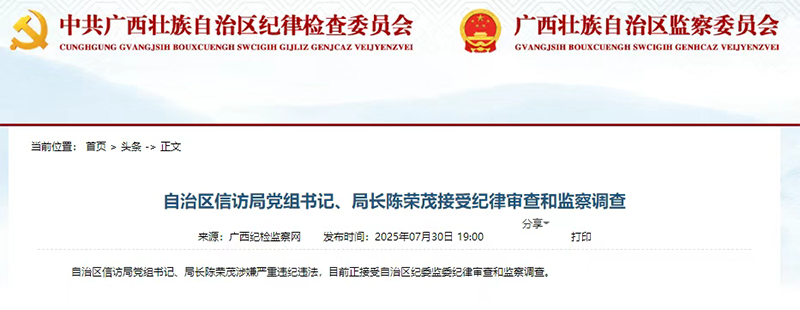 廣西紀(jì)檢監(jiān)察網(wǎng)7月30日下午發(fā)布消息:自治區(qū)信訪局黨組書(shū)記、局長(zhǎng)陳榮茂涉嫌嚴(yán)重違紀(jì)違法,目前正接受自治區(qū)紀(jì)委監(jiān)委紀(jì)律審查和監(jiān)察調(diào)查。