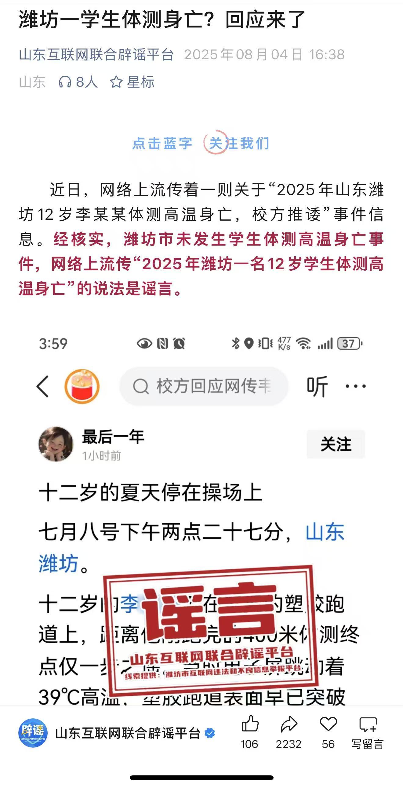 記者注意到,8月4日下午,山東互聯(lián)網(wǎng)聯(lián)合辟謠平臺發(fā)布辟謠信息:近日,網(wǎng)絡(luò)上流傳著一則關(guān)于“2025年山東濰坊12歲李某某體測高溫身亡,校方推諉”事件信息。經(jīng)核實(shí),濰坊市未發(fā)生學(xué)生體測高溫身亡事件,網(wǎng)絡(luò)上流傳“2025年濰坊一名12歲學(xué)生體測高溫身亡”的說法是謠言。