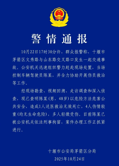 10月25日凌晨,湖北省十堰市公安局茅箭區(qū)分局發(fā)布警情通報:10月22日17時30分許,群眾報警稱,十堰市茅箭區(qū)文秀路與山東路交叉路口發(fā)生一起交通事故。公安機關(guān)迅速組織警力趕赴現(xiàn)場處置,當場控制車輛駕駛員陳某,并全力協(xié)助開展傷員救治等工作。