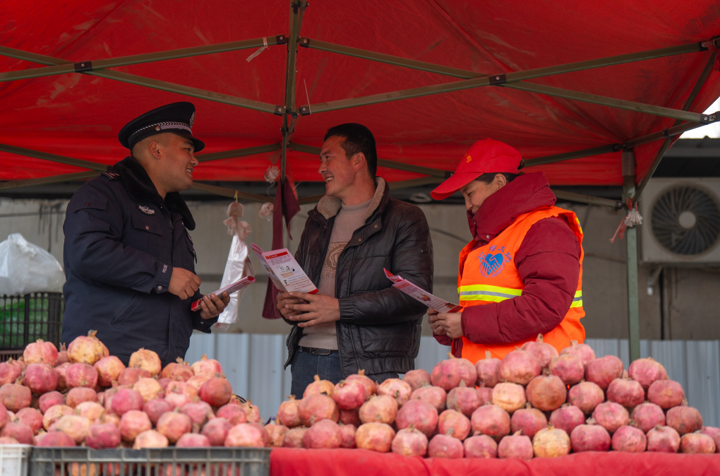 12月12日,新疆維吾爾自治區(qū)葉城縣伯西熱克鎮(zhèn)派出所以“石榴警務”為抓手,踐行新時代“楓橋經(jīng)驗”,緊扣優(yōu)化營商環(huán)境、助力鄉(xiāng)村振興目標,組織“石榴大媽”“石榴義警”隊伍,深入集市、石榴種植合作社、小微企業(yè)等重點區(qū)域,開展巡邏防控、隱患排查、普法宣傳、糾紛調(diào)處“一站式”服務。