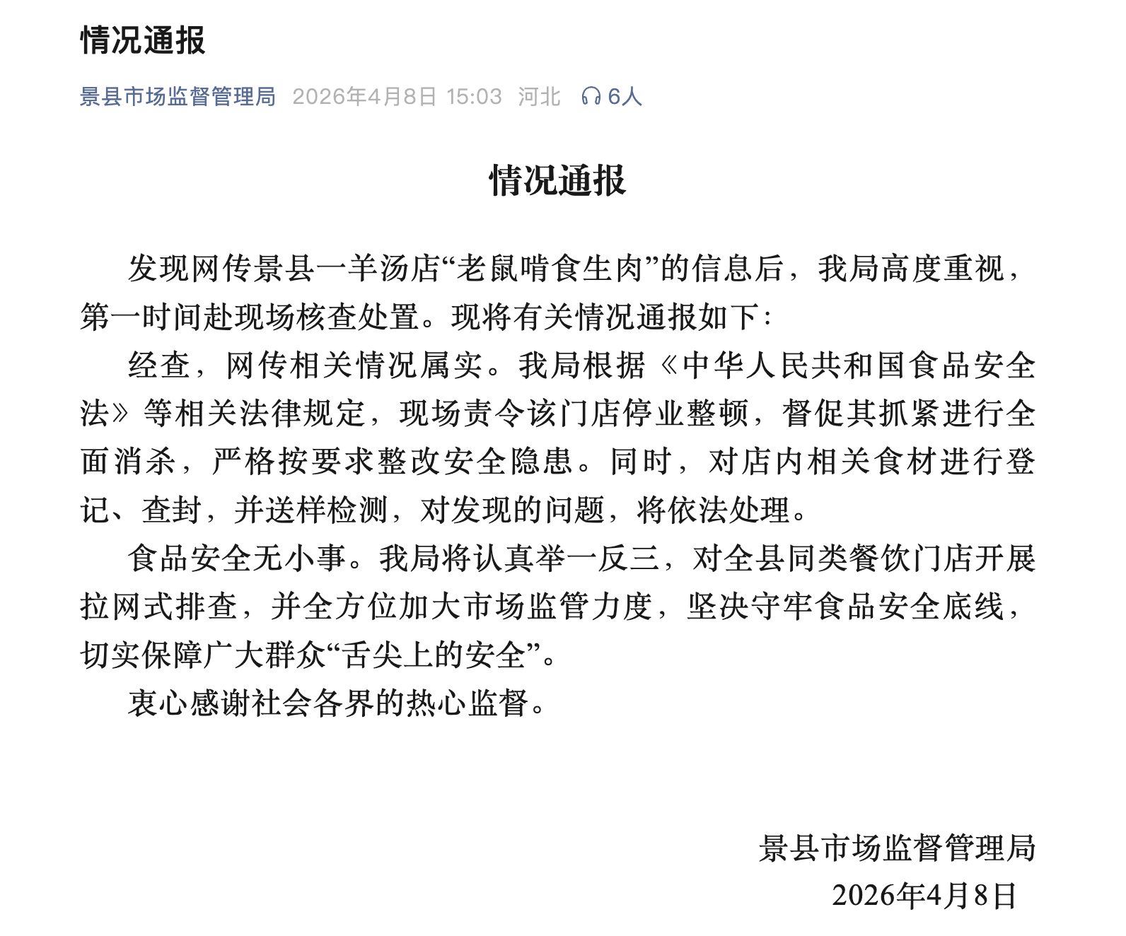 4月8日,景縣市場監(jiān)督管理局發(fā)布情況通報稱,發(fā)現(xiàn)網(wǎng)傳景縣一羊湯店“老鼠啃食生肉”的信息后,該局高度重視,第一時間赴現(xiàn)場核查處置。現(xiàn)將有關(guān)情況通報如下: