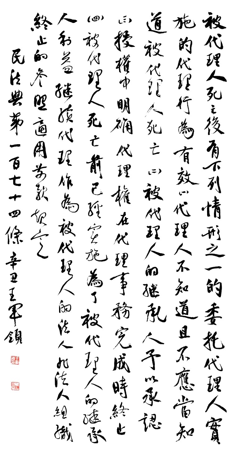 民法典第一百七十四條 被代理人死亡后,有下列情形之一的,委托代理人實施的代理行為有效: