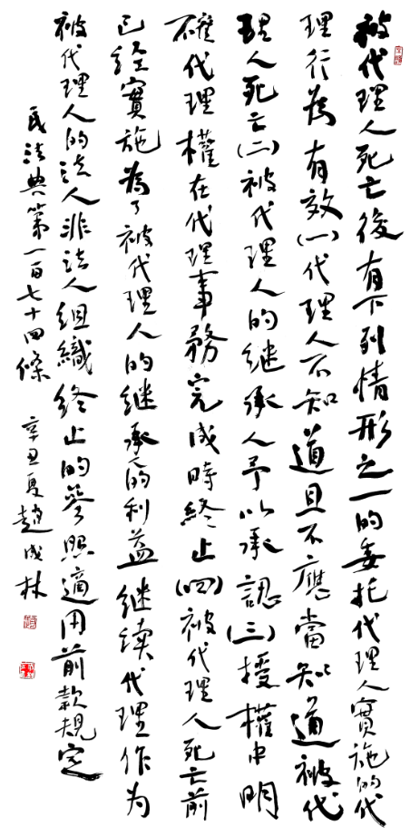 民法典第一百七十四條 被代理人死亡后,有下列情形之一的,委托代理人實施的代理行為有效: