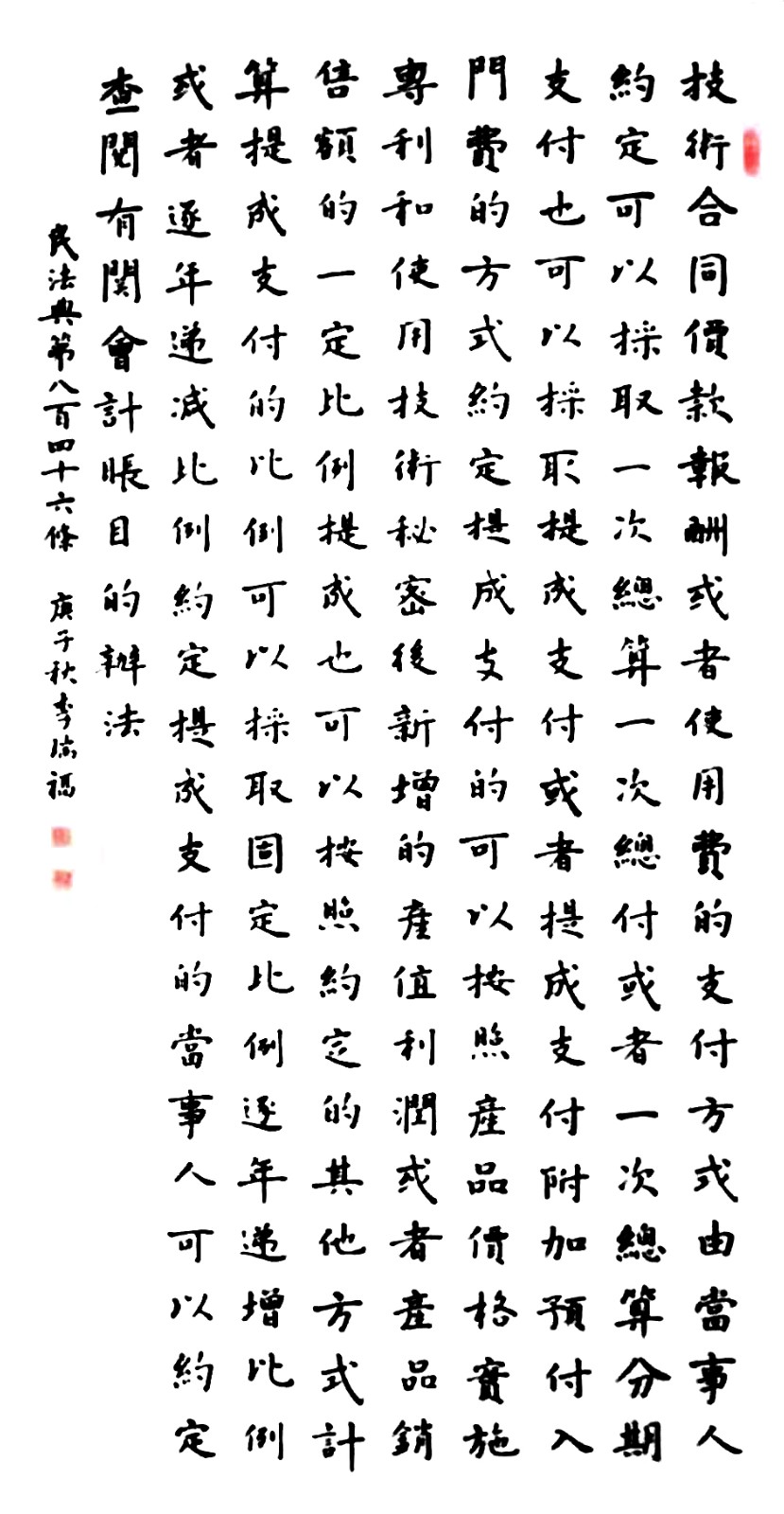 民法典第八百四十六條 技術(shù)合同價款、報酬或者使用費的支付方式由當事人約定,可以采取一次總算、一次總付或者一次總算、分期支付,也可以采取提成支付或者提成支付附加預付入門費的方式。