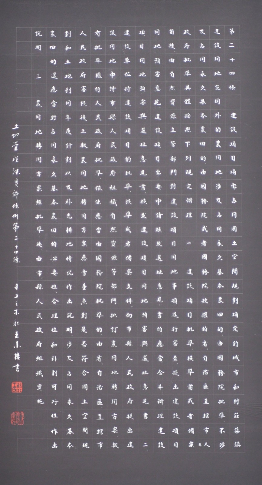 繼1600余位書法家參與書寫《中華人民共和國民法典》全部1260條法條之后,法治日?qǐng)?bào)社聯(lián)合自然資源部法規(guī)司、自然資源部書畫研究會(huì)和北京昌平書法家協(xié)會(huì),將筆端對(duì)準(zhǔn)土地管理“一法一條例”,即《中華人民共和國土地管理法》和《中華人民共和國土地管理法實(shí)施條例》。