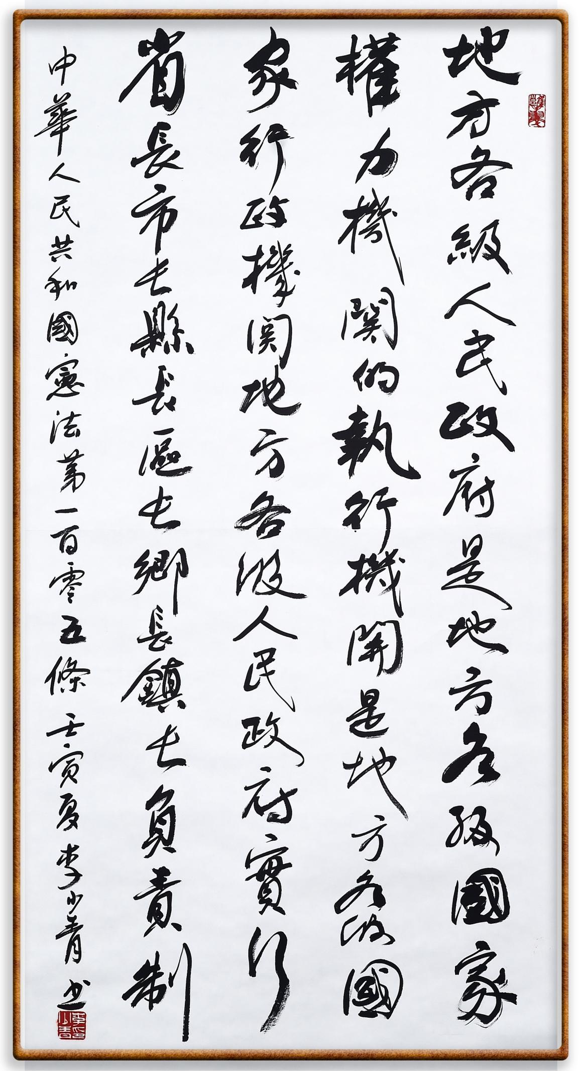 繼《中華人民共和國民法典》《中華人民共和國土地管理法》《中華人民共和國土地管理法實施條例》《中華人民共和國法律援助法》之后,法治日報社聯(lián)合北京市司法局、北京書法家協(xié)會,將筆端對準《中華人民共和國憲法》和《中華人民共和國行政處罰法》。