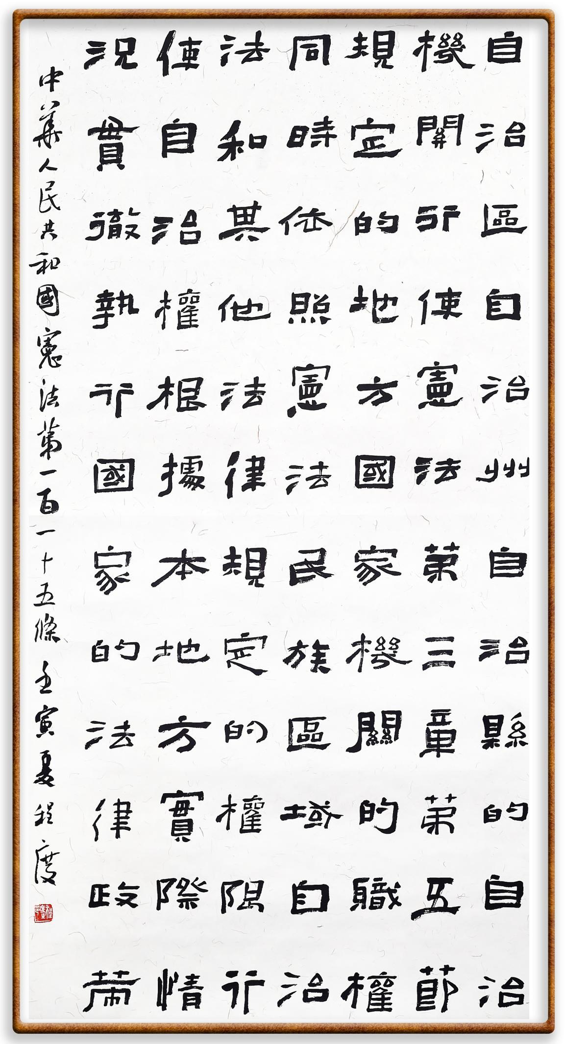 繼《中華人民共和國民法典》《中華人民共和國土地管理法》《中華人民共和國土地管理法實施條例》《中華人民共和國法律援助法》之后,法治日報社聯(lián)合北京市司法局、北京書法家協(xié)會,將筆端對準(zhǔn)《中華人民共和國憲法》和《中華人民共和國行政處罰法》。