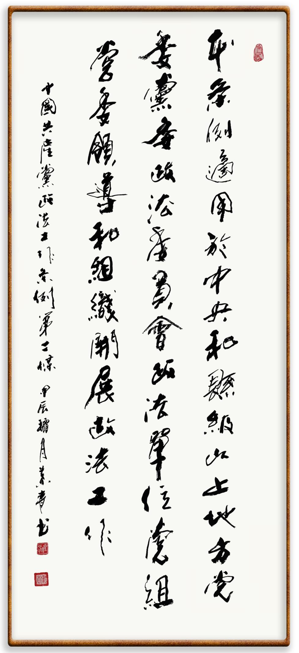 《中國共產(chǎn)黨政法工作條例》對(duì)黨領(lǐng)導(dǎo)新時(shí)代政法工作進(jìn)行全面制度擘畫,為黨領(lǐng)導(dǎo)政法工作提供基本遵循,具有重大而深遠(yuǎn)的意義。為學(xué)習(xí)好、宣傳好、貫徹好、實(shí)施好這部黨內(nèi)法規(guī),繼《中華人民共和國民法典》《中華人民共和國憲法》《信訪工作條例》《中華人民共和國澳門特別行政區(qū)基本法》《中華人民共和國香港特別行政區(qū)基本法》等法律法規(guī)之后,“書·法”系列活動(dòng)將筆端對(duì)準(zhǔn)《中國共產(chǎn)黨政法工作條例》。