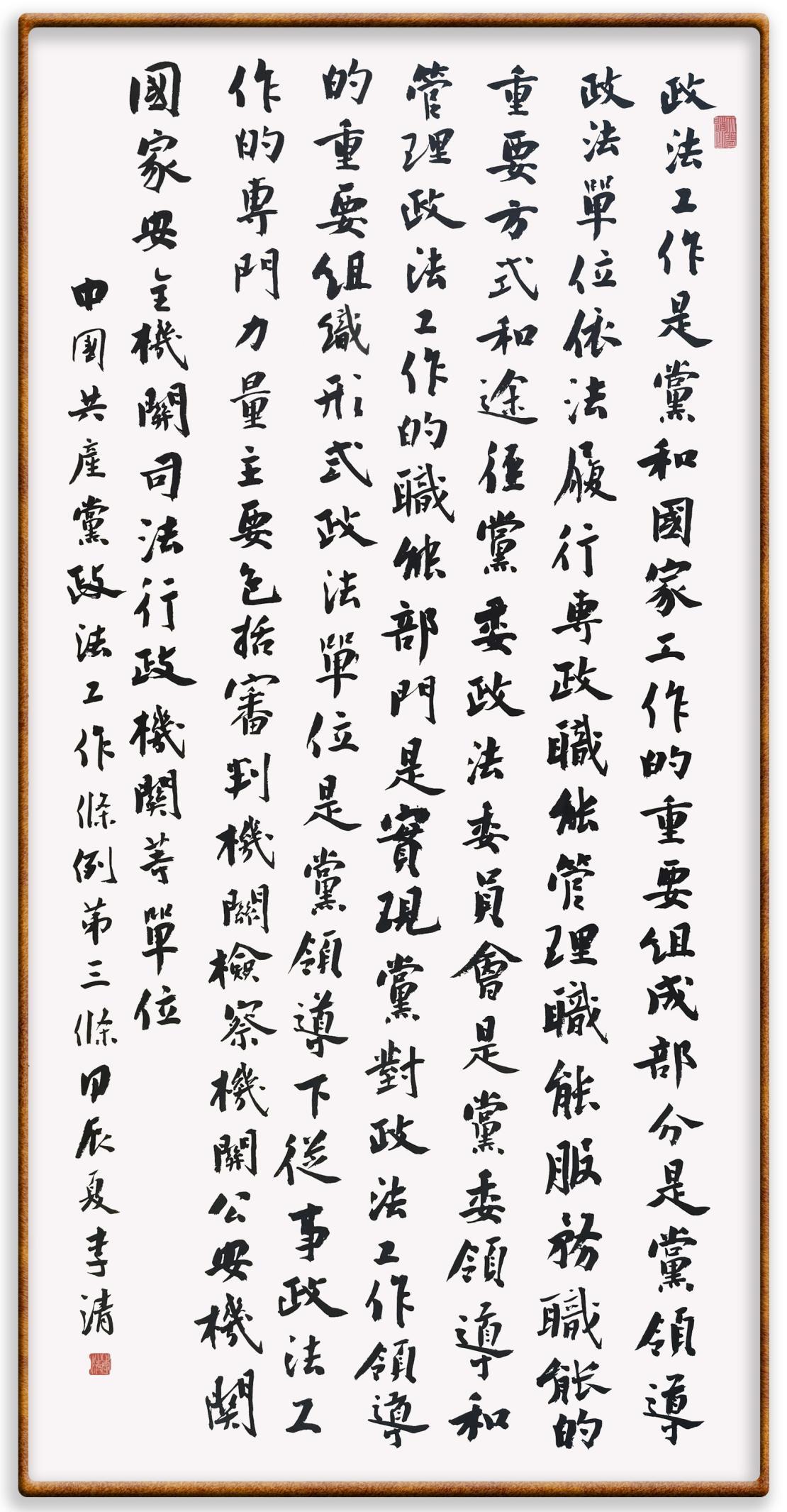 《中國(guó)共產(chǎn)黨政法工作條例》對(duì)黨領(lǐng)導(dǎo)新時(shí)代政法工作進(jìn)行全面制度擘畫,為黨領(lǐng)導(dǎo)政法工作提供基本遵循,具有重大而深遠(yuǎn)的意義。為學(xué)習(xí)好、宣傳好、貫徹好、實(shí)施好這部黨內(nèi)法規(guī),繼《中華人民共和國(guó)民法典》《中華人民共和國(guó)憲法》《信訪工作條例》《中華人民共和國(guó)澳門特別行政區(qū)基本法》《中華人民共和國(guó)香港特別行政區(qū)基本法》等法律法規(guī)之后,“書·法”系列活動(dòng)將筆端對(duì)準(zhǔn)《中國(guó)共產(chǎn)黨政法工作條例》。