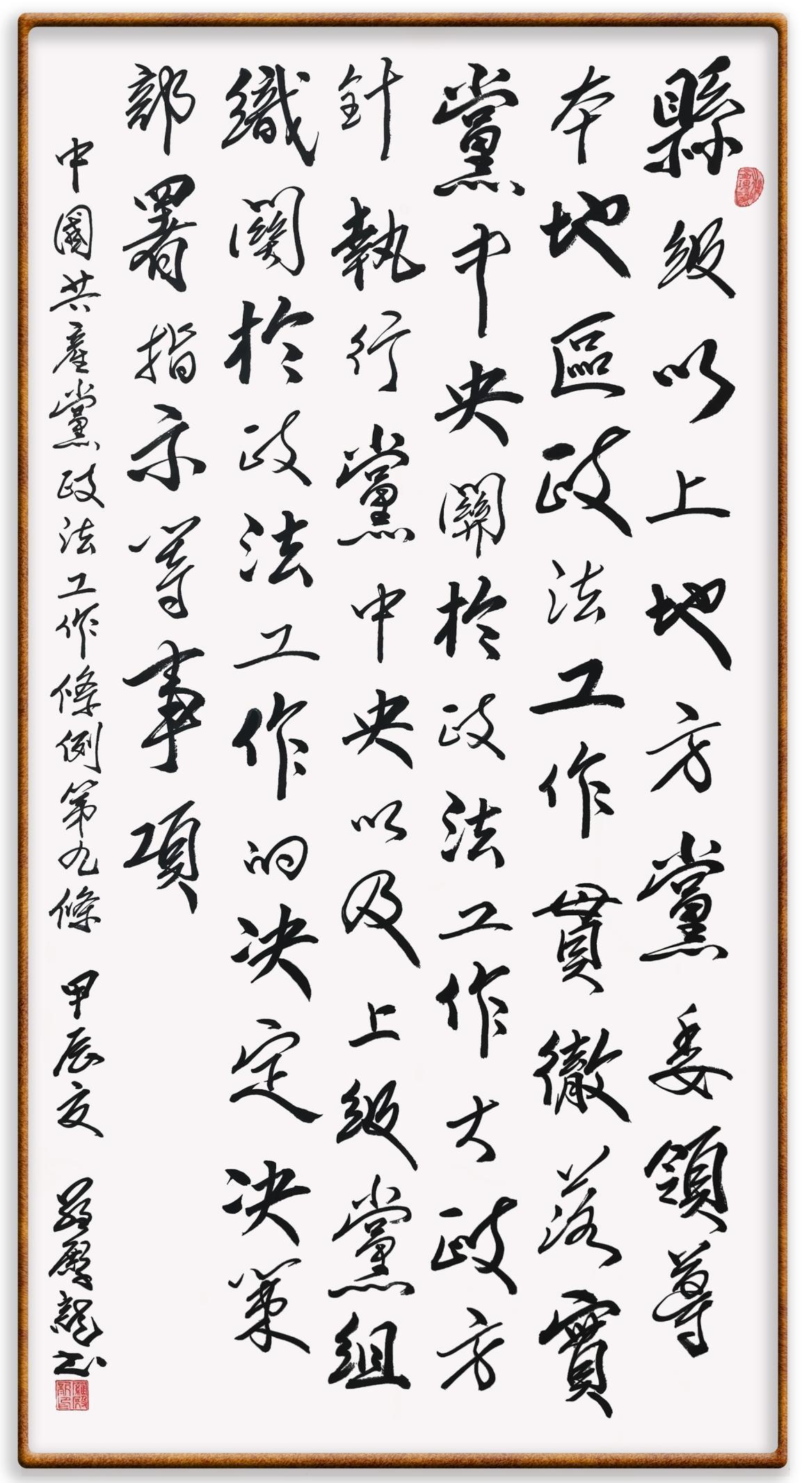 《中國共產(chǎn)黨政法工作條例》對黨領導新時代政法工作進行全面制度擘畫,為黨領導政法工作提供基本遵循,具有重大而深遠的意義。為學習好、宣傳好、貫徹好、實施好這部黨內(nèi)法規(guī),繼《中華人民共和國民法典》《中華人民共和國憲法》《信訪工作條例》《中華人民共和國澳門特別行政區(qū)基本法》《中華人民共和國香港特別行政區(qū)基本法》等法律法規(guī)之后,“書·法”系列活動將筆端對準《中國共產(chǎn)黨政法工作條例》。