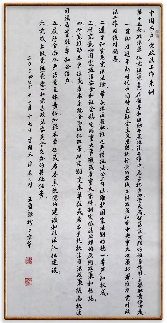 《中國(guó)共產(chǎn)黨政法工作條例》對(duì)黨領(lǐng)導(dǎo)新時(shí)代政法工作進(jìn)行全面制度擘畫(huà),為黨領(lǐng)導(dǎo)政法工作提供基本遵循,具有重大而深遠(yuǎn)的意義。為學(xué)習(xí)好、宣傳好、貫徹好、實(shí)施好這部黨內(nèi)法規(guī),繼《中華人民共和國(guó)民法典》《中華人民共和國(guó)憲法》《信訪(fǎng)工作條例》《中華人民共和國(guó)澳門(mén)特別行政區(qū)基本法》《中華人民共和國(guó)香港特別行政區(qū)基本法》等法律法規(guī)之后,“書(shū)·法”系列活動(dòng)將筆端對(duì)準(zhǔn)《中國(guó)共產(chǎn)黨政法工作條例》。