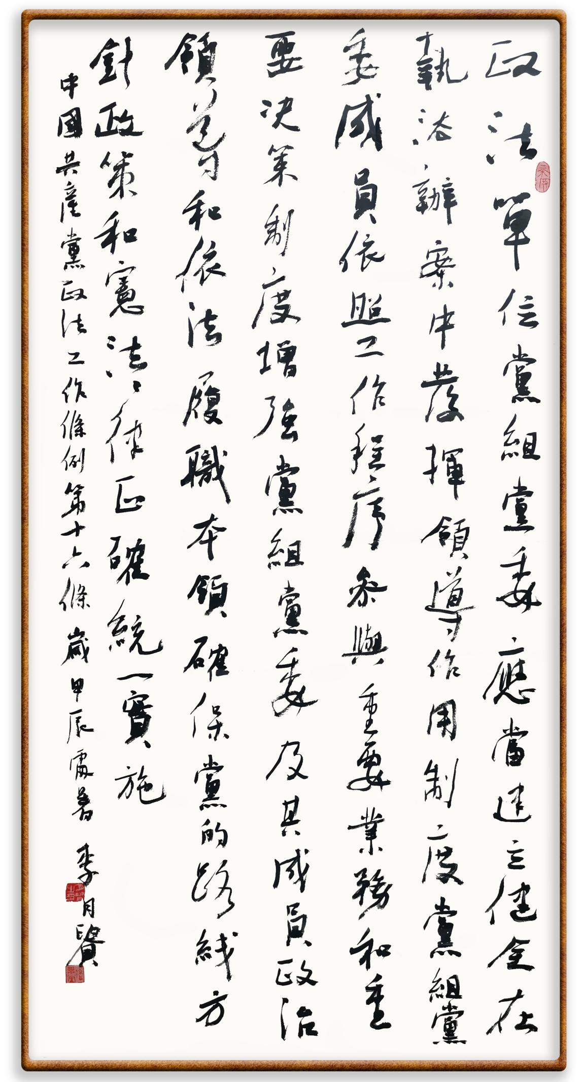 《中國共產(chǎn)黨政法工作條例》對黨領(lǐng)導(dǎo)新時代政法工作進(jìn)行全面制度擘畫,為黨領(lǐng)導(dǎo)政法工作提供基本遵循,具有重大而深遠(yuǎn)的意義。為學(xué)習(xí)好、宣傳好、貫徹好、實施好這部黨內(nèi)法規(guī),繼《中華人民共和國民法典》《中華人民共和國憲法》《信訪工作條例》《中華人民共和國澳門特別行政區(qū)基本法》《中華人民共和國香港特別行政區(qū)基本法》等法律法規(guī)之后,“書·法”系列活動將筆端對準(zhǔn)《中國共產(chǎn)黨政法工作條例》。