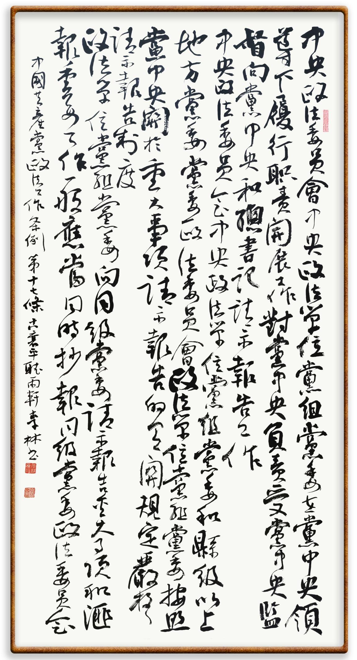《中國共產(chǎn)黨政法工作條例》對黨領(lǐng)導(dǎo)新時代政法工作進(jìn)行全面制度擘畫,為黨領(lǐng)導(dǎo)政法工作提供基本遵循,具有重大而深遠(yuǎn)的意義。為學(xué)習(xí)好、宣傳好、貫徹好、實施好這部黨內(nèi)法規(guī),繼《中華人民共和國民法典》《中華人民共和國憲法》《信訪工作條例》《中華人民共和國澳門特別行政區(qū)基本法》《中華人民共和國香港特別行政區(qū)基本法》等法律法規(guī)之后,“書·法”系列活動將筆端對準(zhǔn)《中國共產(chǎn)黨政法工作條例》。