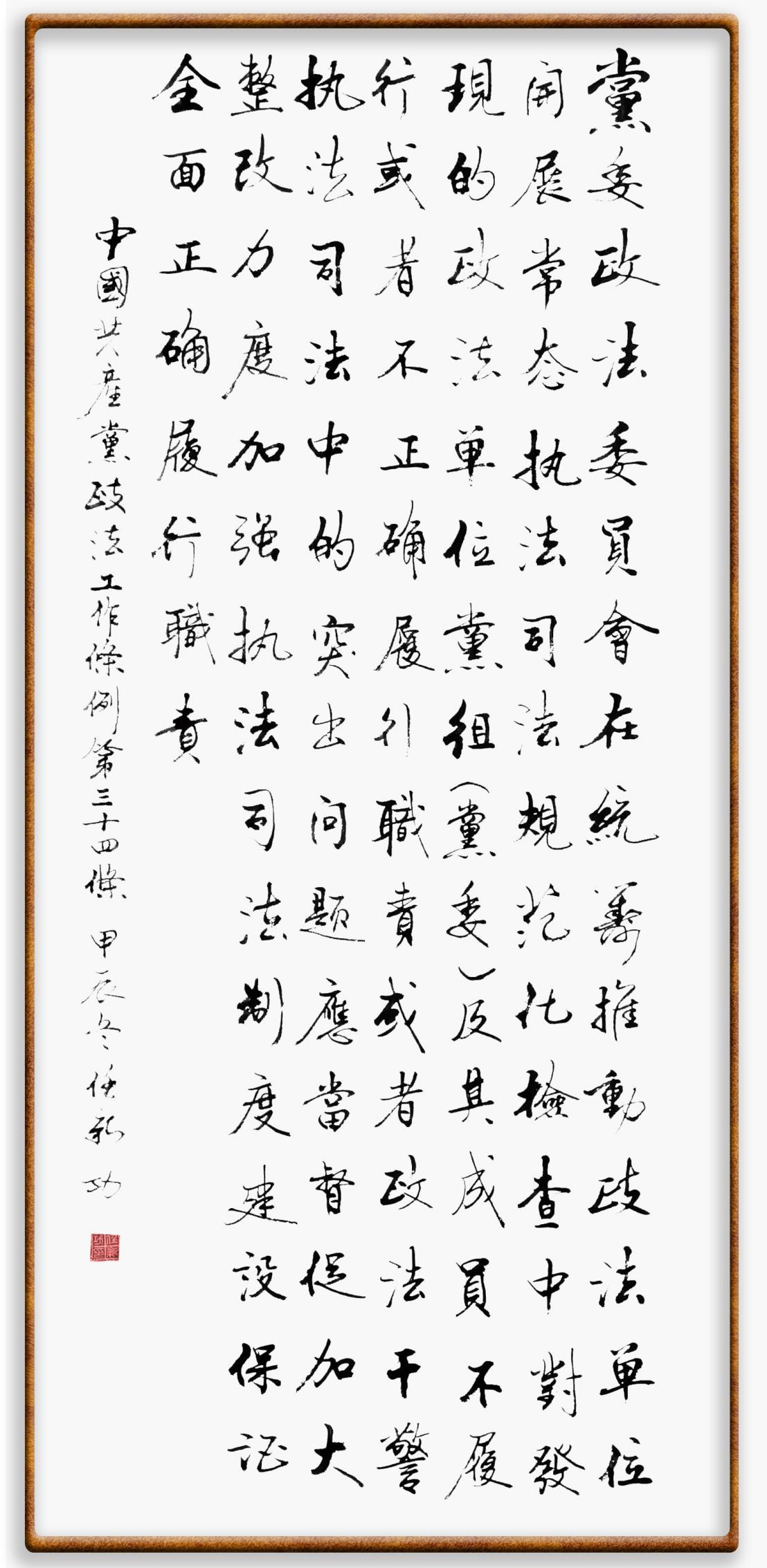 《中國共產(chǎn)黨政法工作條例》對黨領(lǐng)導(dǎo)新時(shí)代政法工作進(jìn)行全面制度擘畫,為黨領(lǐng)導(dǎo)政法工作提供基本遵循,具有重大而深遠(yuǎn)的意義。為學(xué)習(xí)好、宣傳好、貫徹好、實(shí)施好這部黨內(nèi)法規(guī),繼《中華人民共和國民法典》《中華人民共和國憲法》《信訪工作條例》《中華人民共和國澳門特別行政區(qū)基本法》《中華人民共和國香港特別行政區(qū)基本法》等法律法規(guī)之后,“書·法”系列活動(dòng)將筆端對準(zhǔn)《中國共產(chǎn)黨政法工作條例》。