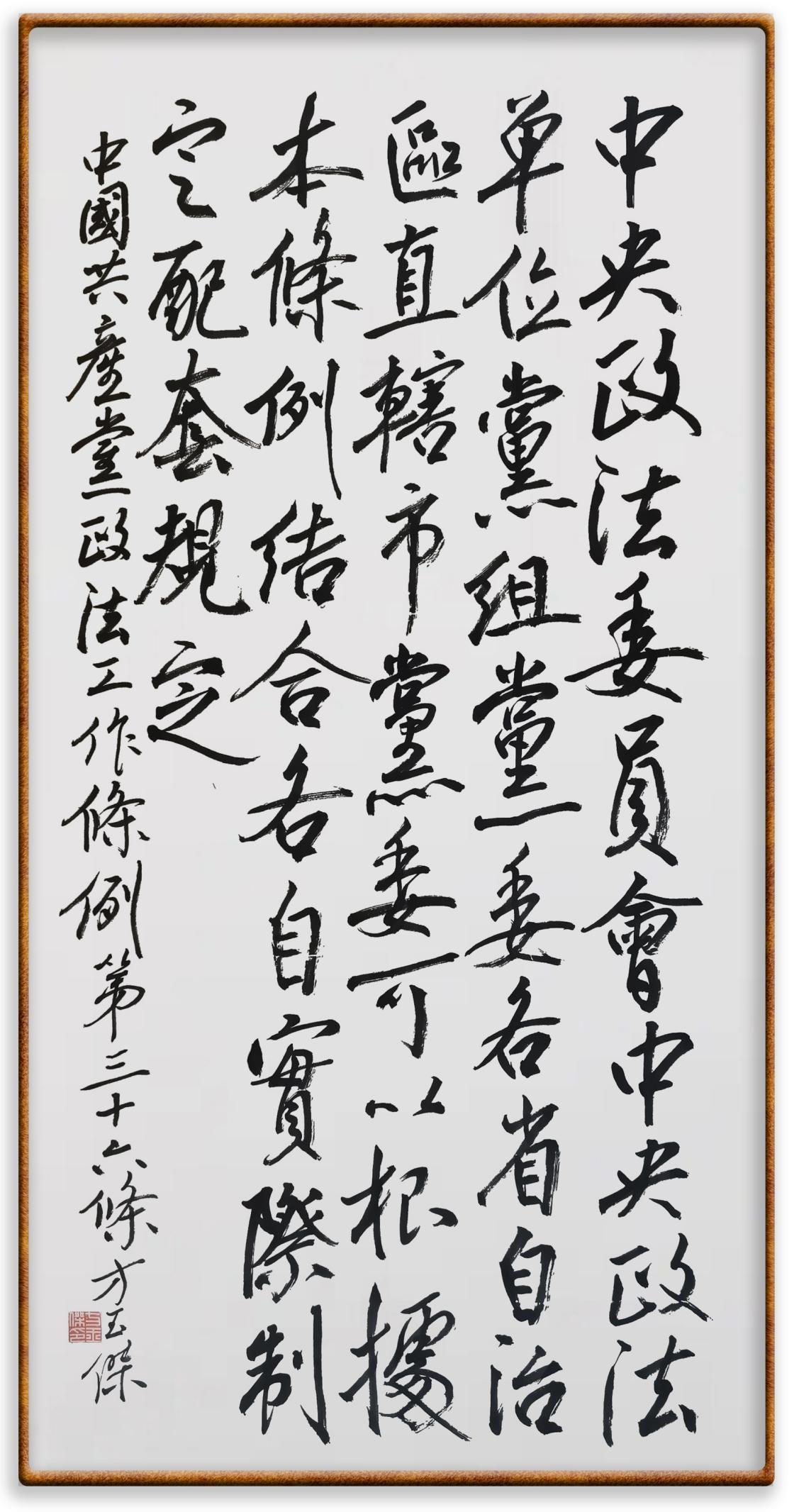 《中國(guó)共產(chǎn)黨政法工作條例》對(duì)黨領(lǐng)導(dǎo)新時(shí)代政法工作進(jìn)行全面制度擘畫(huà),為黨領(lǐng)導(dǎo)政法工作提供基本遵循,具有重大而深遠(yuǎn)的意義。為學(xué)習(xí)好、宣傳好、貫徹好、實(shí)施好這部黨內(nèi)法規(guī),繼《中華人民共和國(guó)民法典》《中華人民共和國(guó)憲法》《信訪工作條例》《中華人民共和國(guó)澳門(mén)特別行政區(qū)基本法》《中華人民共和國(guó)香港特別行政區(qū)基本法》等法律法規(guī)之后,“書(shū)·法”系列活動(dòng)將筆端對(duì)準(zhǔn)《中國(guó)共產(chǎn)黨政法工作條例》。