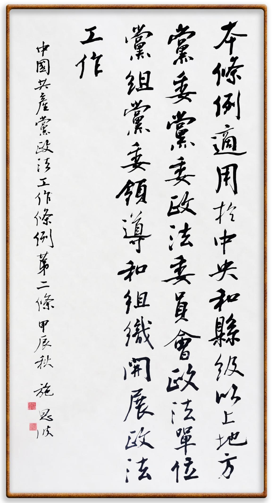 《中國(guó)共產(chǎn)黨政法工作條例》對(duì)黨領(lǐng)導(dǎo)新時(shí)代政法工作進(jìn)行全面制度擘畫(huà),為黨領(lǐng)導(dǎo)政法工作提供基本遵循,具有重大而深遠(yuǎn)的意義。為學(xué)習(xí)好、宣傳好、貫徹好、實(shí)施好這部黨內(nèi)法規(guī),繼《中華人民共和國(guó)民法典》《中華人民共和國(guó)憲法》《信訪(fǎng)工作條例》《中華人民共和國(guó)澳門(mén)特別行政區(qū)基本法》《中華人民共和國(guó)香港特別行政區(qū)基本法》等法律法規(guī)之后,“書(shū)·法”系列活動(dòng)將筆端對(duì)準(zhǔn)《中國(guó)共產(chǎn)黨政法工作條例》。