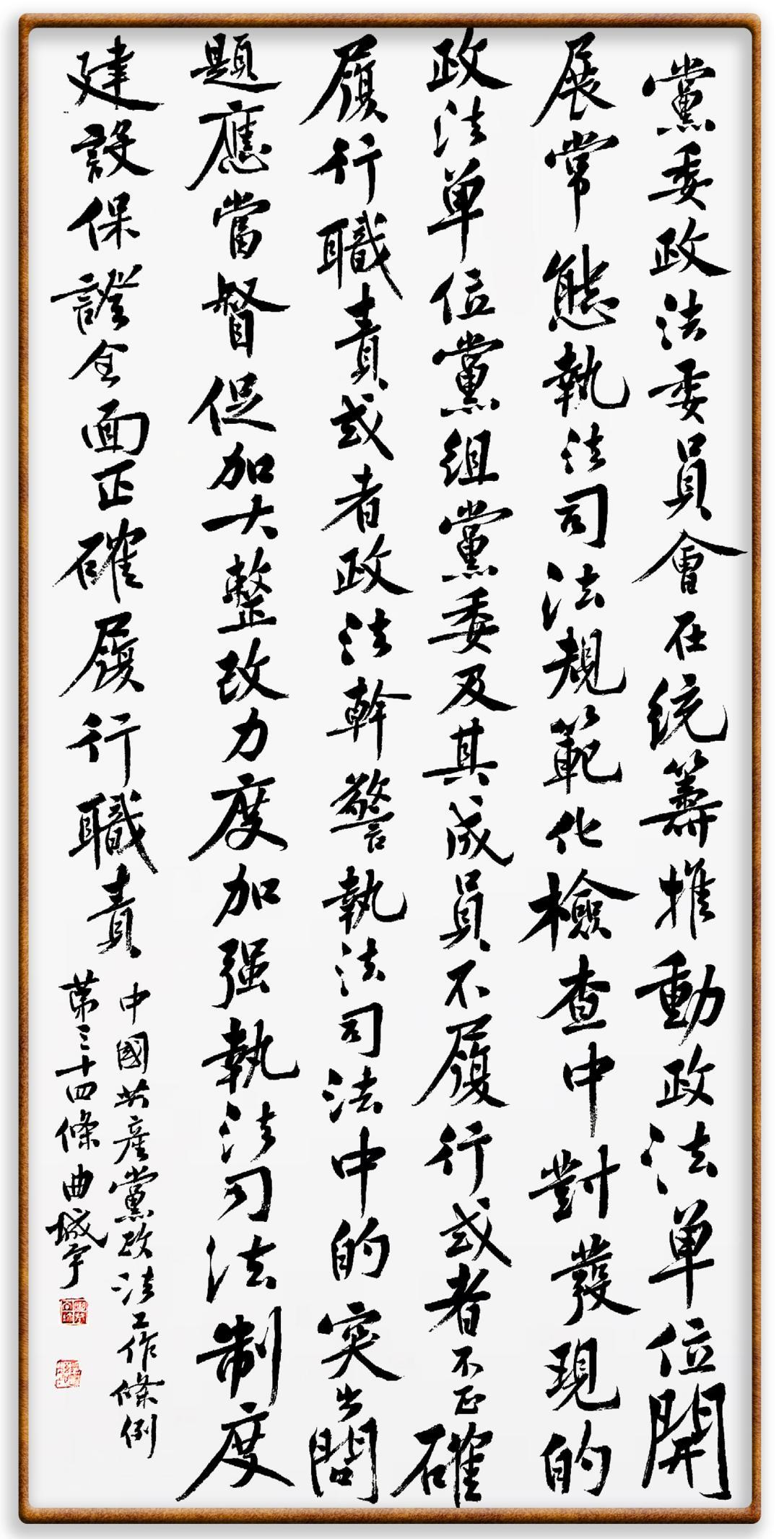 《中國共產(chǎn)黨政法工作條例》對黨領(lǐng)導(dǎo)新時代政法工作進(jìn)行全面制度擘畫,為黨領(lǐng)導(dǎo)政法工作提供基本遵循,具有重大而深遠(yuǎn)的意義。為學(xué)習(xí)好、宣傳好、貫徹好、實施好這部黨內(nèi)法規(guī),繼《中華人民共和國民法典》《中華人民共和國憲法》《信訪工作條例》《中華人民共和國澳門特別行政區(qū)基本法》《中華人民共和國香港特別行政區(qū)基本法》等法律法規(guī)之后,“書·法”系列活動將筆端對準(zhǔn)《中國共產(chǎn)黨政法工作條例》。