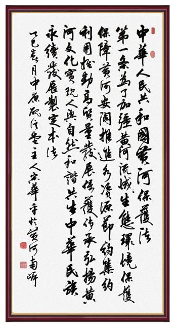 黃河寧,天下平。黃河是中華民族的發(fā)源地和搖籃,保護(hù)黃河是事關(guān)中華民族偉大復(fù)興的千秋大計?!吨腥A人民共和國黃河保護(hù)法》為推進(jìn)水資源節(jié)約集約利用、保護(hù)傳承弘揚(yáng)黃河文化、推動黃河流域生態(tài)保護(hù)和高質(zhì)量發(fā)展提供了有力法治保障。繼書寫《中華人民共和國民法典》《中華人民共和國憲法》《中華人民共和國澳門特別行政區(qū)基本法》《中華人民共和國香港特別行政區(qū)基本法》《中華人民共和國國旗法》《中華人民共和國國徽法》《中華人民共和國國歌法》《中華人民共和國法官法》等法律之后,法制日報社聯(lián)合沿黃九?。▍^(qū))司法廳、書法家協(xié)會,將筆端對準(zhǔn)《中華人民共和國黃河保護(hù)法》。