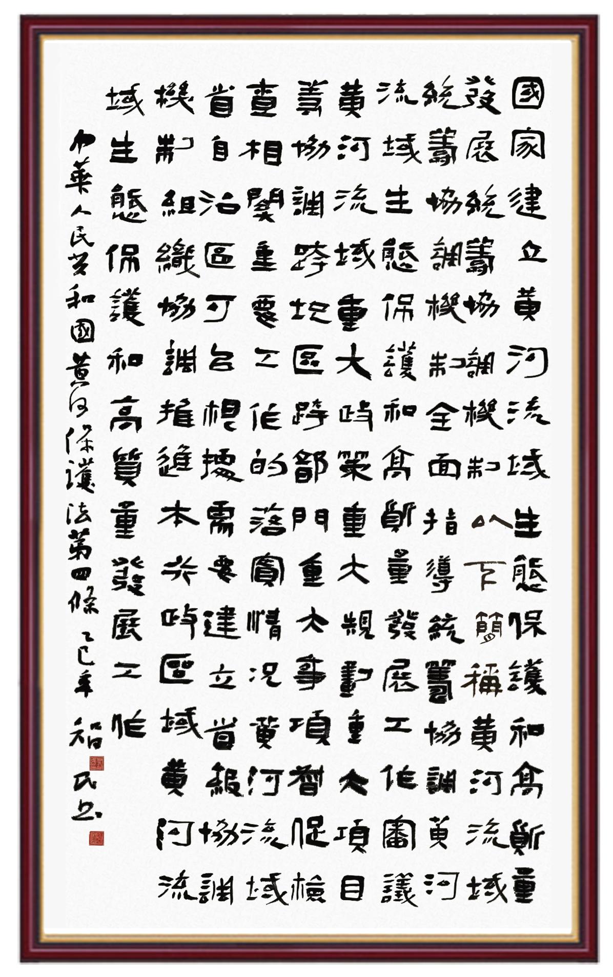 黃河寧,天下平。黃河是中華民族的發(fā)源地和搖籃,保護(hù)黃河是事關(guān)中華民族偉大復(fù)興的千秋大計?!吨腥A人民共和國黃河保護(hù)法》為推進(jìn)水資源節(jié)約集約利用、保護(hù)傳承弘揚(yáng)黃河文化、推動黃河流域生態(tài)保護(hù)和高質(zhì)量發(fā)展提供了有力法治保障。繼書寫《中華人民共和國民法典》《中華人民共和國憲法》《中華人民共和國澳門特別行政區(qū)基本法》《中華人民共和國香港特別行政區(qū)基本法》《中華人民共和國國旗法》《中華人民共和國國徽法》《中華人民共和國國歌法》《中華人民共和國法官法》等法律法規(guī)之后,法制日報社聯(lián)合沿黃九?。▍^(qū))司法廳、書法家協(xié)會,將筆端對準(zhǔn)《中華人民共和國黃河保護(hù)法》。