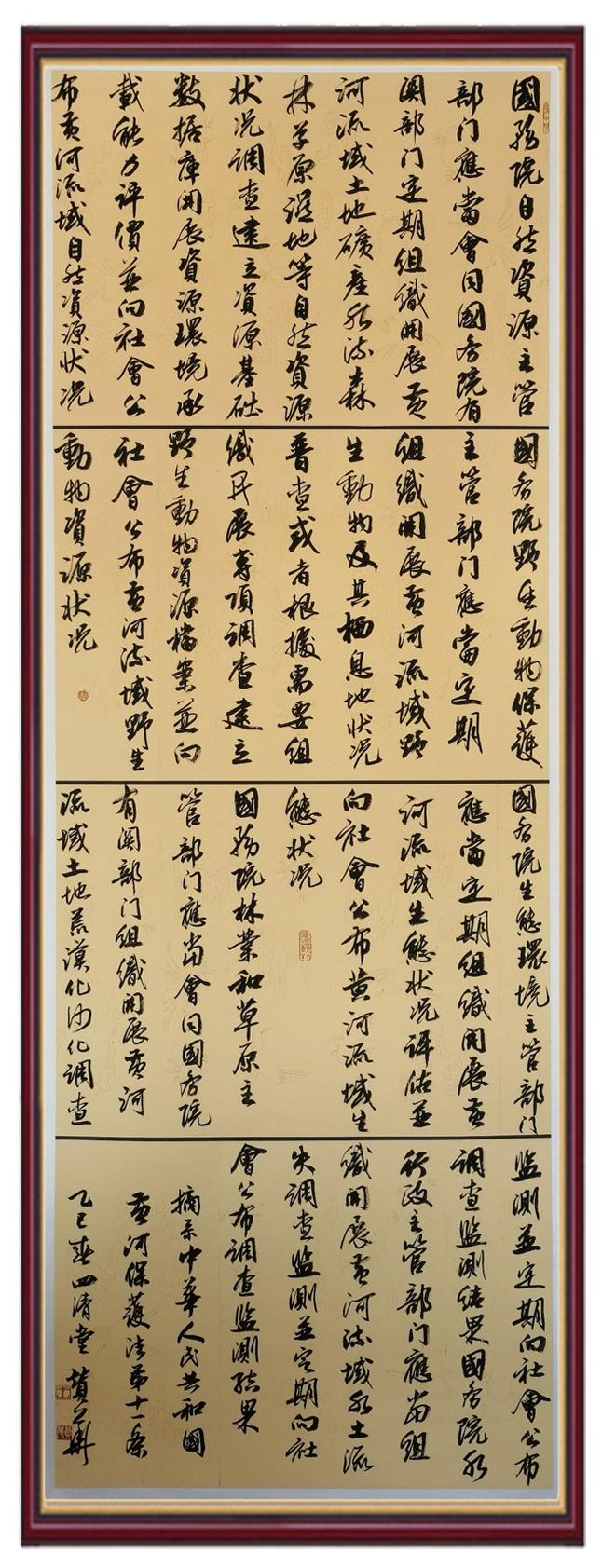 黃河寧,天下平。黃河是中華民族的發(fā)源地和搖籃,保護(hù)黃河是事關(guān)中華民族偉大復(fù)興的千秋大計。《中華人民共和國黃河保護(hù)法》為推進(jìn)水資源節(jié)約集約利用、保護(hù)傳承弘揚黃河文化、推動黃河流域生態(tài)保護(hù)和高質(zhì)量發(fā)展提供了有力法治保障。繼書寫《中華人民共和國民法典》《中華人民共和國憲法》《中華人民共和國澳門特別行政區(qū)基本法》《中華人民共和國香港特別行政區(qū)基本法》《中華人民共和國國旗法》《中華人民共和國國徽法》《中華人民共和國國歌法》《中華人民共和國法官法》等法律法規(guī)之后,法制日報社聯(lián)合沿黃九省(區(qū))司法廳、書法家協(xié)會,將筆端對準(zhǔn)《中華人民共和國黃河保護(hù)法》。