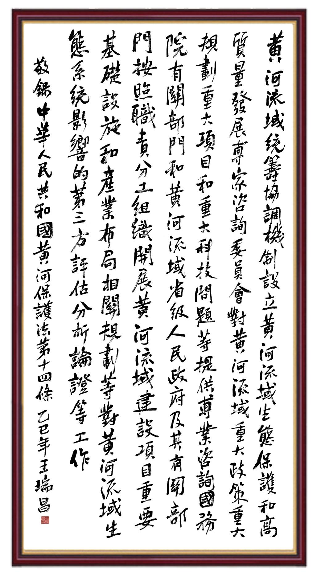 黃河寧,天下平。黃河是中華民族的發(fā)源地和搖籃,保護(hù)黃河是事關(guān)中華民族偉大復(fù)興的千秋大計(jì)。《中華人民共和國(guó)黃河保護(hù)法》為推進(jìn)水資源節(jié)約集約利用、保護(hù)傳承弘揚(yáng)黃河文化、推動(dòng)黃河流域生態(tài)保護(hù)和高質(zhì)量發(fā)展提供了有力法治保障。繼書(shū)寫(xiě)《中華人民共和國(guó)民法典》《中華人民共和國(guó)憲法》《中華人民共和國(guó)澳門(mén)特別行政區(qū)基本法》《中華人民共和國(guó)香港特別行政區(qū)基本法》《中華人民共和國(guó)國(guó)旗法》《中華人民共和國(guó)國(guó)徽法》《中華人民共和國(guó)國(guó)歌法》《中華人民共和國(guó)法官法》等法律法規(guī)之后,法制日?qǐng)?bào)社聯(lián)合沿黃九?。▍^(qū))司法廳、書(shū)法家協(xié)會(huì),將筆端對(duì)準(zhǔn)《中華人民共和國(guó)黃河保護(hù)法》。