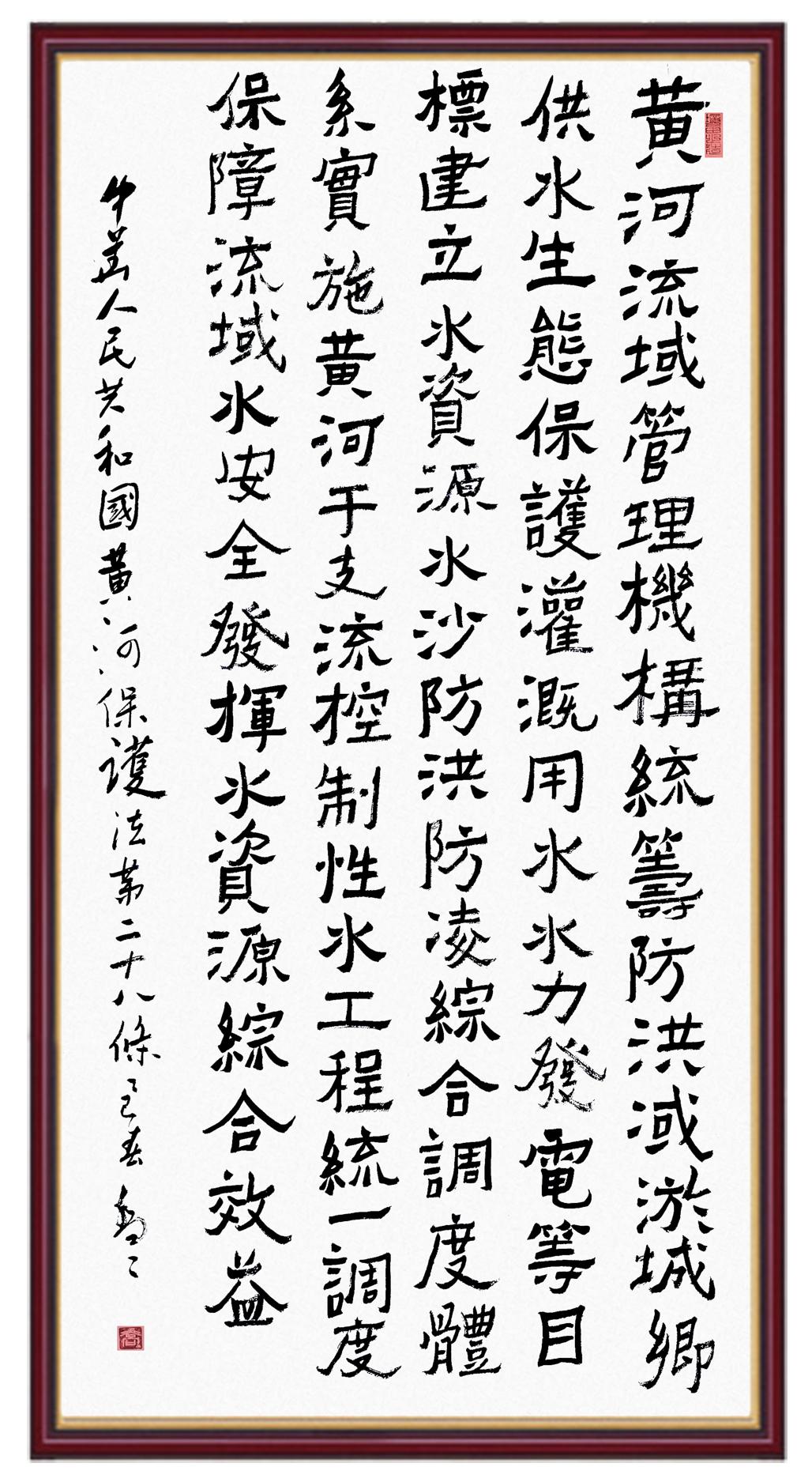 黃河寧,天下平。黃河是中華民族的發(fā)源地和搖籃,保護(hù)黃河是事關(guān)中華民族偉大復(fù)興的千秋大計(jì)?!吨腥A人民共和國黃河保護(hù)法》為推進(jìn)水資源節(jié)約集約利用、保護(hù)傳承弘揚(yáng)黃河文化、推動(dòng)黃河流域生態(tài)保護(hù)和高質(zhì)量發(fā)展提供了有力法治保障。繼書寫《中華人民共和國民法典》《中華人民共和國憲法》《中華人民共和國澳門特別行政區(qū)基本法》《中華人民共和國香港特別行政區(qū)基本法》《中華人民共和國國旗法》《中華人民共和國國徽法》《中華人民共和國國歌法》《中華人民共和國法官法》等法律法規(guī)之后,法制日報(bào)社聯(lián)合沿黃九?。▍^(qū))司法廳、書法家協(xié)會,將筆端對準(zhǔn)《中華人民共和國黃河保護(hù)法》。