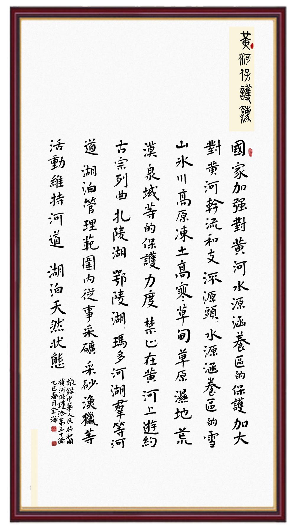 黃河寧,天下平。黃河是中華民族的發(fā)源地和搖籃,保護黃河是事關(guān)中華民族偉大復(fù)興的千秋大計?!吨腥A人民共和國黃河保護法》為推進水資源節(jié)約集約利用、保護傳承弘揚黃河文化、推動黃河流域生態(tài)保護和高質(zhì)量發(fā)展提供了有力法治保障。繼書寫《中華人民共和國民法典》《中華人民共和國憲法》《中華人民共和國澳門特別行政區(qū)基本法》《中華人民共和國香港特別行政區(qū)基本法》《中華人民共和國國旗法》《中華人民共和國國徽法》《中華人民共和國國歌法》《中華人民共和國法官法》等法律法規(guī)之后,法制日報社聯(lián)合沿黃九?。▍^(qū))司法廳、書法家協(xié)會,將筆端對準(zhǔn)《中華人民共和國黃河保護法》。