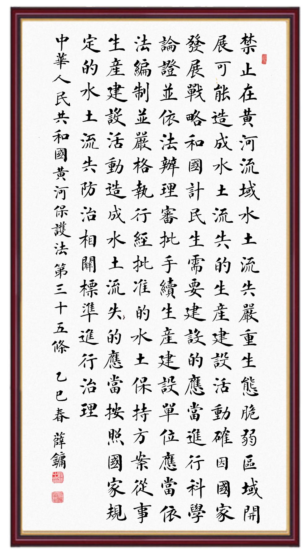 黃河寧,天下平。黃河是中華民族的發(fā)源地和搖籃,保護黃河是事關中華民族偉大復興的千秋大計?!吨腥A人民共和國黃河保護法》為推進水資源節(jié)約集約利用、保護傳承弘揚黃河文化、推動黃河流域生態(tài)保護和高質量發(fā)展提供了有力法治保障。繼書寫《中華人民共和國民法典》《中華人民共和國憲法》《中華人民共和國澳門特別行政區(qū)基本法》《中華人民共和國香港特別行政區(qū)基本法》《中華人民共和國國旗法》《中華人民共和國國徽法》《中華人民共和國國歌法》《中華人民共和國法官法》等法律法規(guī)之后,法制日報社聯(lián)合沿黃九省(區(qū))司法廳、書法家協(xié)會,將筆端對準《中華人民共和國黃河保護法》。