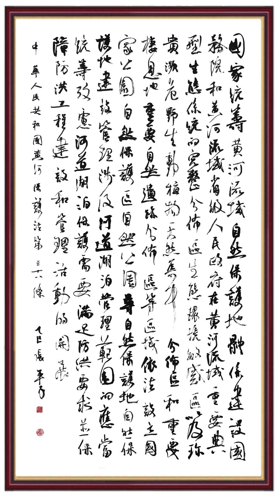 黃河寧,天下平。黃河是中華民族的發(fā)源地和搖籃,保護黃河是事關(guān)中華民族偉大復興的千秋大計?!吨腥A人民共和國黃河保護法》為推進水資源節(jié)約集約利用、保護傳承弘揚黃河文化、推動黃河流域生態(tài)保護和高質(zhì)量發(fā)展提供了有力法治保障。繼書寫《中華人民共和國民法典》《中華人民共和國憲法》《中華人民共和國澳門特別行政區(qū)基本法》《中華人民共和國香港特別行政區(qū)基本法》《中華人民共和國國旗法》《中華人民共和國國徽法》《中華人民共和國國歌法》《中華人民共和國法官法》等法律法規(guī)之后,法制日報社聯(lián)合沿黃九省(區(qū))司法廳、書法家協(xié)會,將筆端對準《中華人民共和國黃河保護法》。