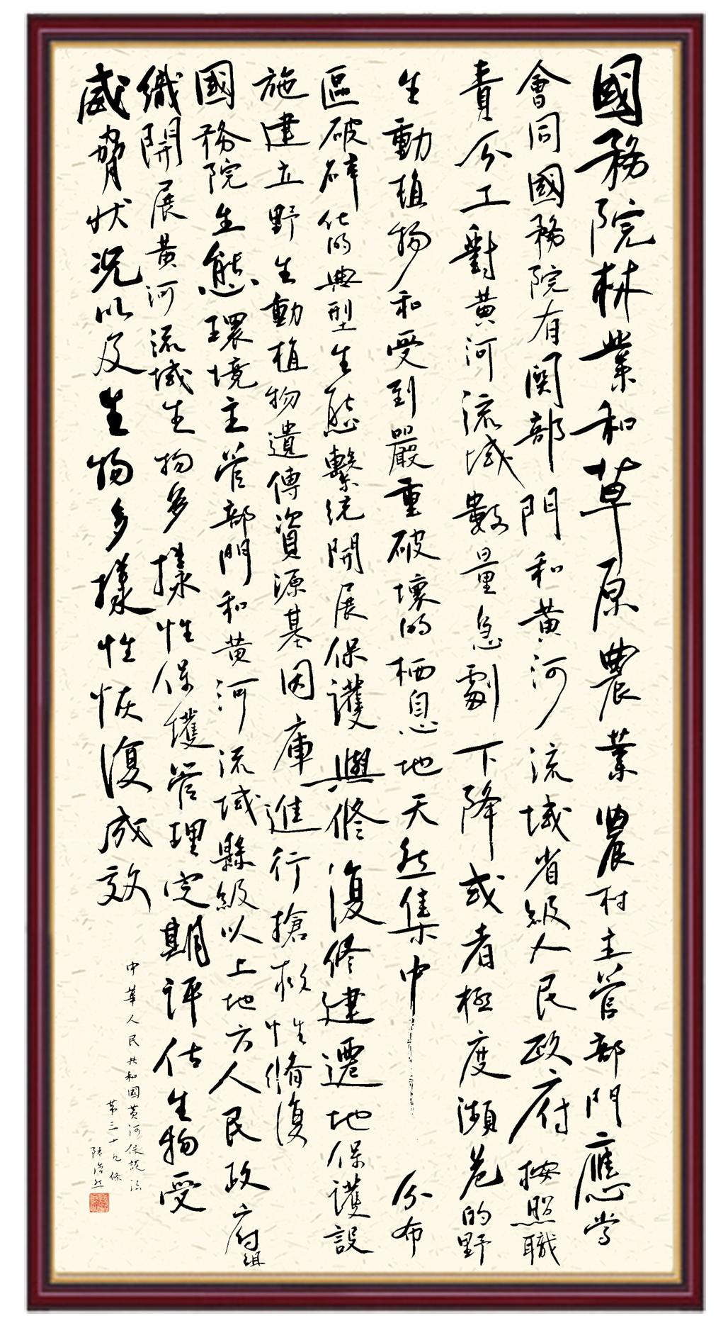 黃河寧,天下平。黃河是中華民族的發(fā)源地和搖籃,保護(hù)黃河是事關(guān)中華民族偉大復(fù)興的千秋大計?!吨腥A人民共和國黃河保護(hù)法》為推進(jìn)水資源節(jié)約集約利用、保護(hù)傳承弘揚黃河文化、推動黃河流域生態(tài)保護(hù)和高質(zhì)量發(fā)展提供了有力法治保障。繼書寫《中華人民共和國民法典》《中華人民共和國憲法》《中華人民共和國澳門特別行政區(qū)基本法》《中華人民共和國香港特別行政區(qū)基本法》《中華人民共和國國旗法》《中華人民共和國國徽法》《中華人民共和國國歌法》《中華人民共和國法官法》等法律法規(guī)之后,法制日報社聯(lián)合沿黃九省(區(qū))司法廳、書法家協(xié)會,將筆端對準(zhǔn)《中華人民共和國黃河保護(hù)法》。