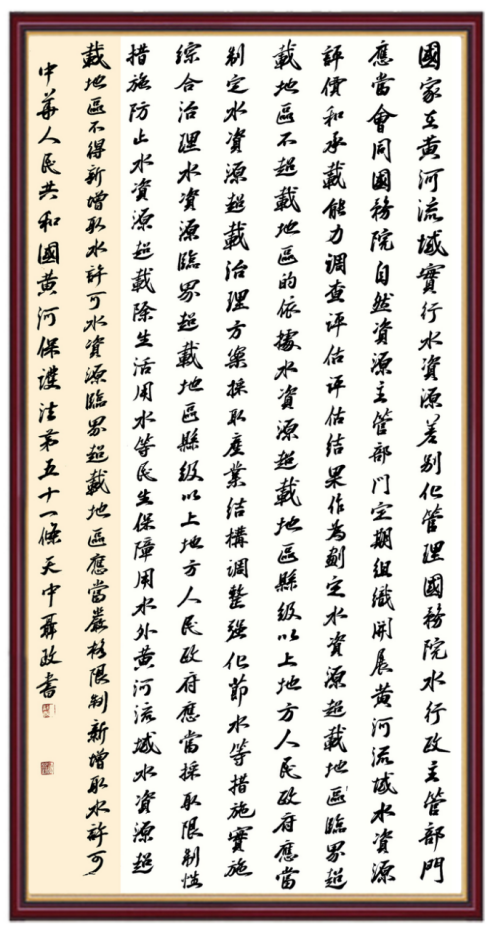 黃河寧,天下平。黃河是中華民族的發(fā)源地和搖籃,保護(hù)黃河是事關(guān)中華民族偉大復(fù)興的千秋大計(jì)?!吨腥A人民共和國(guó)黃河保護(hù)法》為推進(jìn)水資源節(jié)約集約利用、保護(hù)傳承弘揚(yáng)黃河文化、推動(dòng)黃河流域生態(tài)保護(hù)和高質(zhì)量發(fā)展提供了有力法治保障。繼書(shū)寫(xiě)《中華人民共和國(guó)民法典》《中華人民共和國(guó)憲法》《中華人民共和國(guó)澳門(mén)特別行政區(qū)基本法》《中華人民共和國(guó)香港特別行政區(qū)基本法》《中華人民共和國(guó)國(guó)旗法》《中華人民共和國(guó)國(guó)徽法》《中華人民共和國(guó)國(guó)歌法》《中華人民共和國(guó)法官法》等法律法規(guī)之后,法制日?qǐng)?bào)社聯(lián)合沿黃九?。▍^(qū))司法廳、書(shū)法家協(xié)會(huì),將筆端對(duì)準(zhǔn)《中華人民共和國(guó)黃河保護(hù)法》。